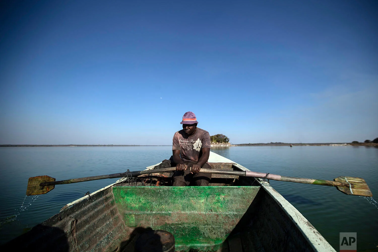 A fisherman rows his boat after casting his nets for the night, in Lake Chivero, west of the capital Harare, in Zimbabwe, Sept. 10, 2019. (AP Photo/Ben Curtis)