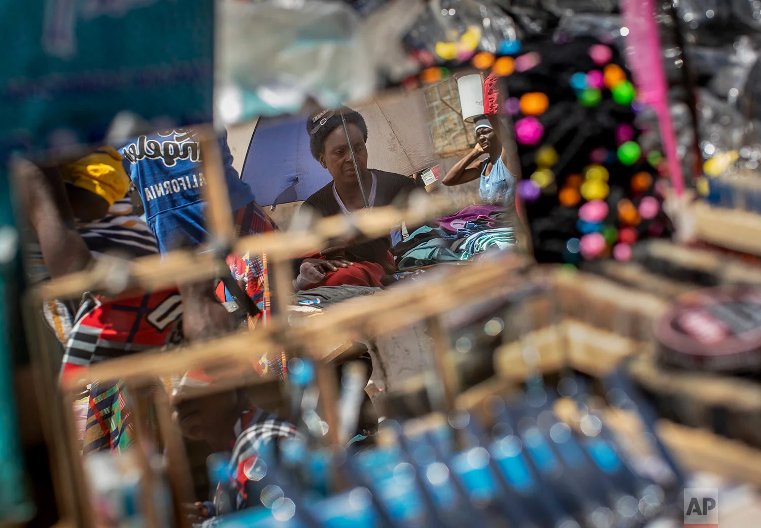 A street seller is seen reflected in mirrors for sale, at a market in the low income neighborhood of Mbare, known to have many supporters of former president Robert Mugabe's ZANU-PF party, in the capital Harare, Zimbabwe, Sept. 9, 2019. (AP Photo/Ben Curtis)