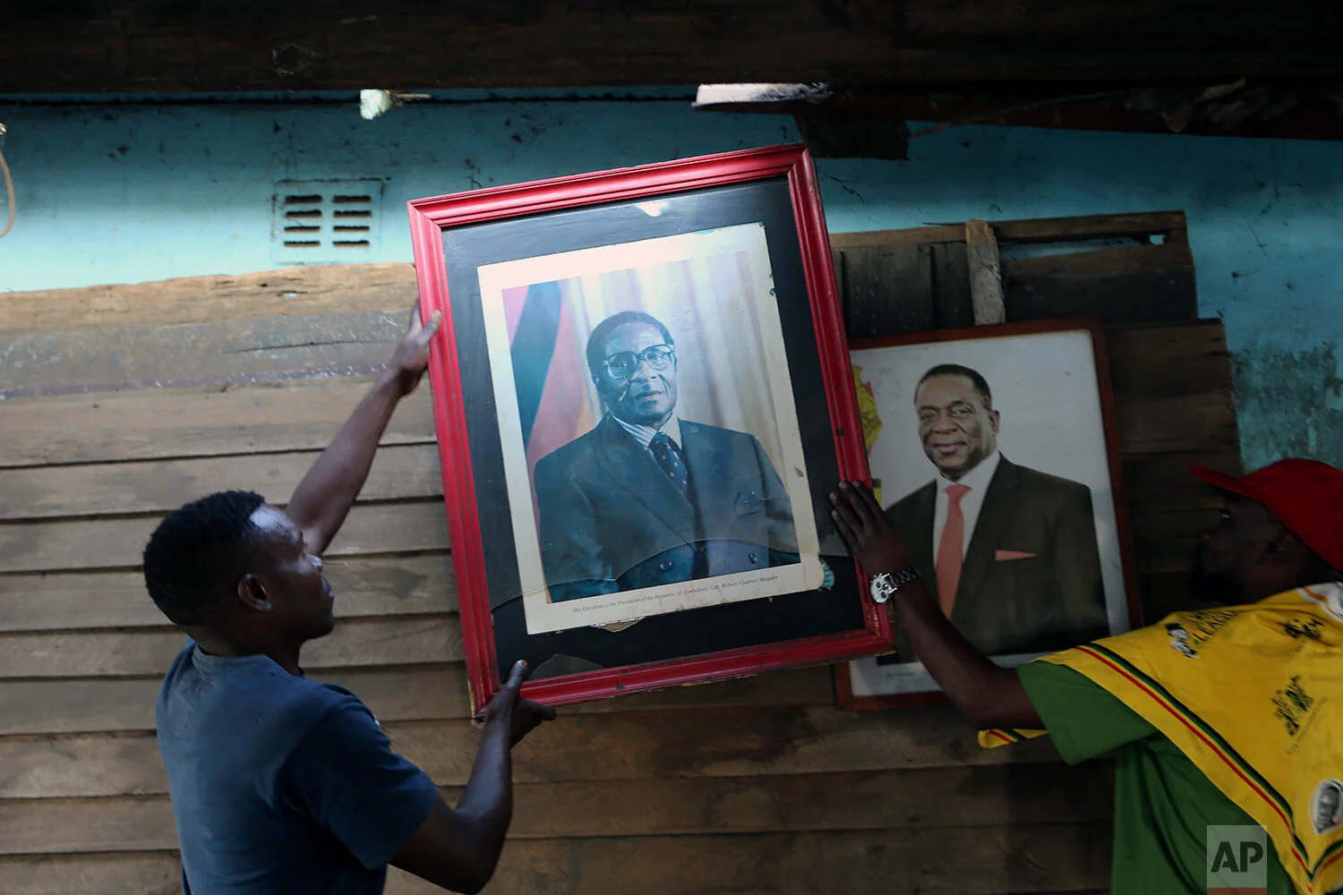 Supporters of former Zimbabwean President Robert Mugabe place his portrait next to that of Zimbabwean President Emmerson Mnangagwa in Harare, Sept, 10, 2019. Mnangagwa declared him a national hero. (AP Photo/Tsvangirayi Mukwazhi, File)