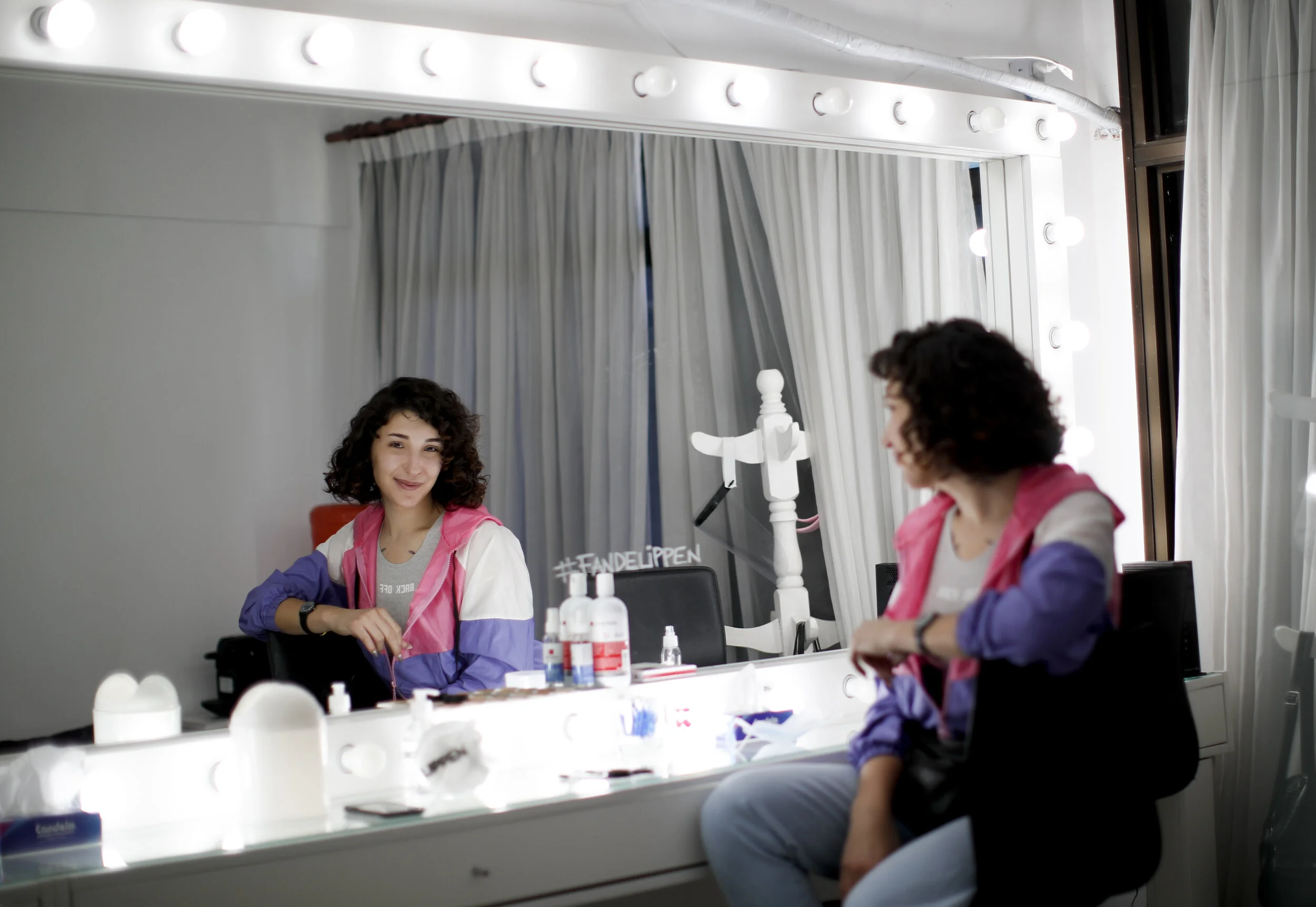 Artist Emma Lusicich poses for a photo in the mirror where she works at a beauty salon that specializes in sculpting eyebrows in Buenos Aires, Argentina, Friday, Nov. 20, 2020. (AP Photo/Natacha Pisarenko)