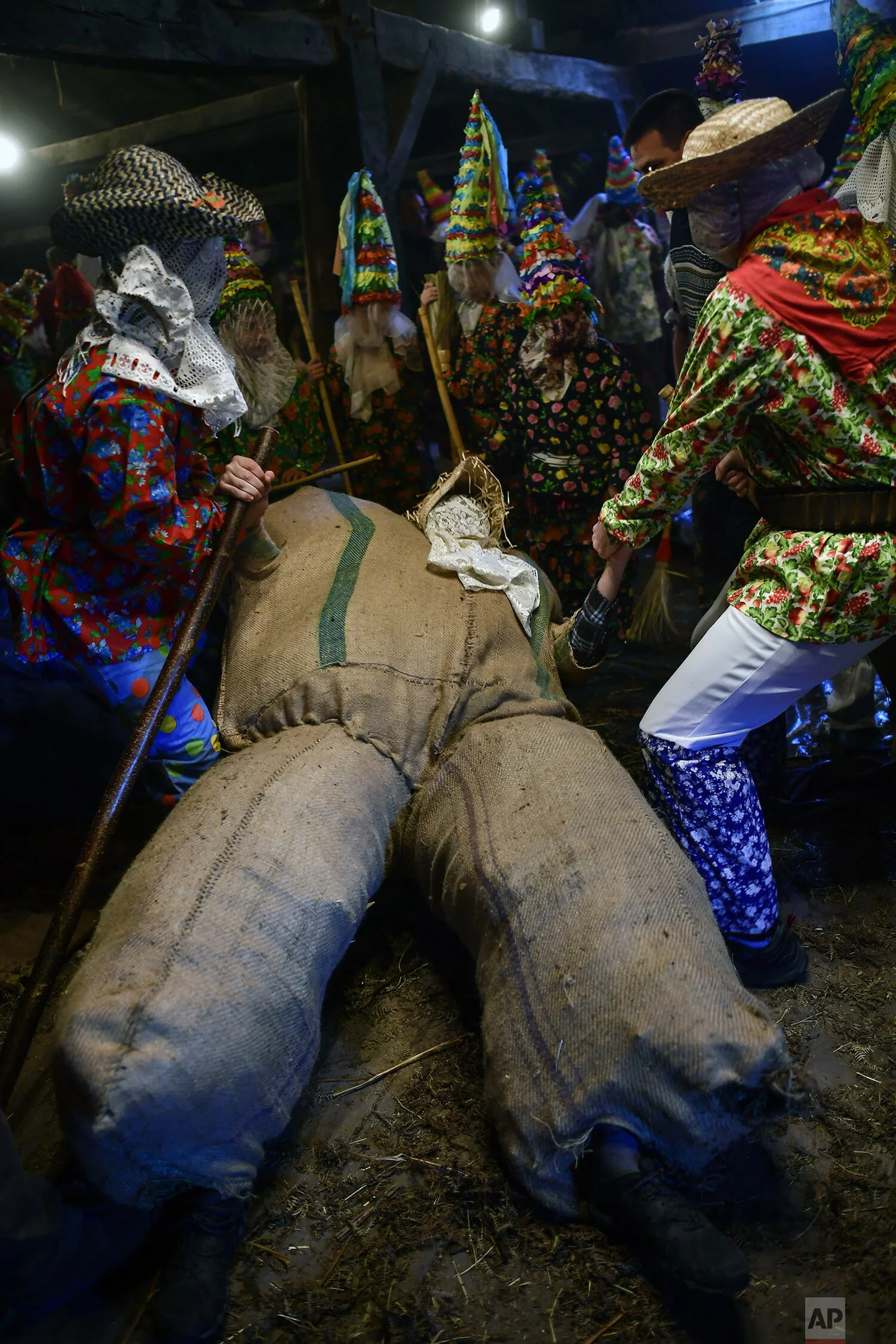 Participants dressed as the traditional carnival character "Zaku Zaharrak," meaning “old sack” in the local Basque language, take part in a carnival parade in the small Pyrenean village of Lesaka, northern Spain, Sunday, Feb. 23, 2020. (AP Photo/Alvaro Barrientos)