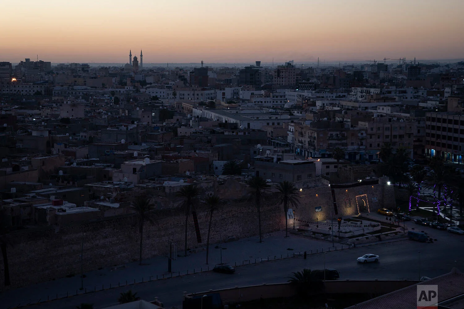 The walls surrounding the Old City are illuminated before sunrise in Tripoli, Libya, Feb. 29, 2020. (AP Photo/Felipe Dana)