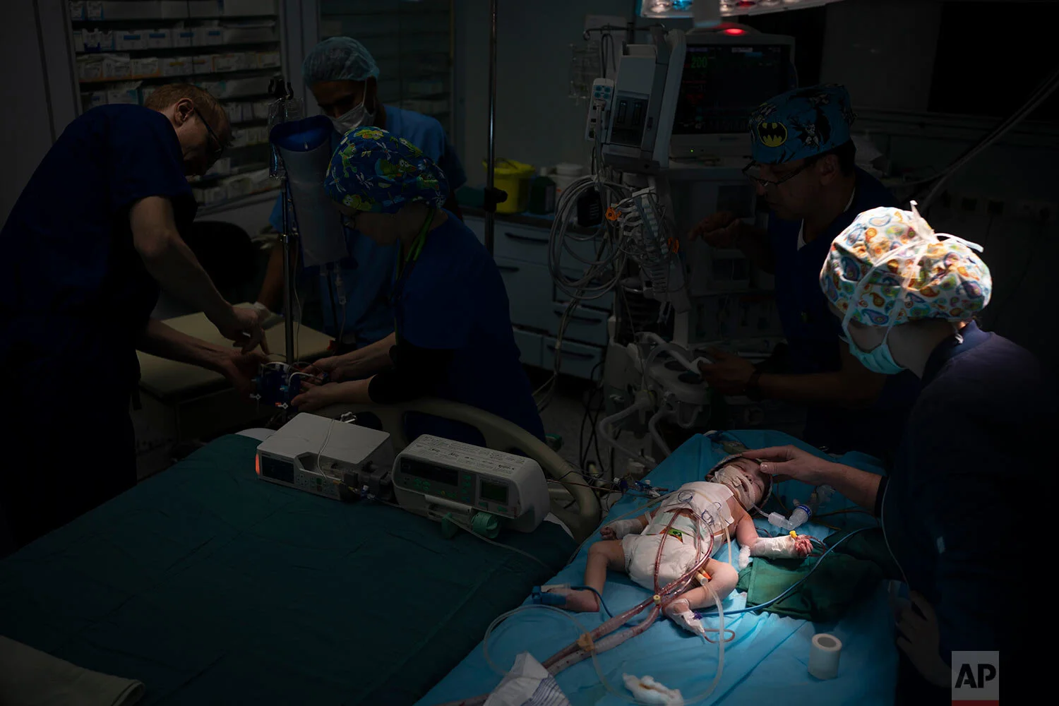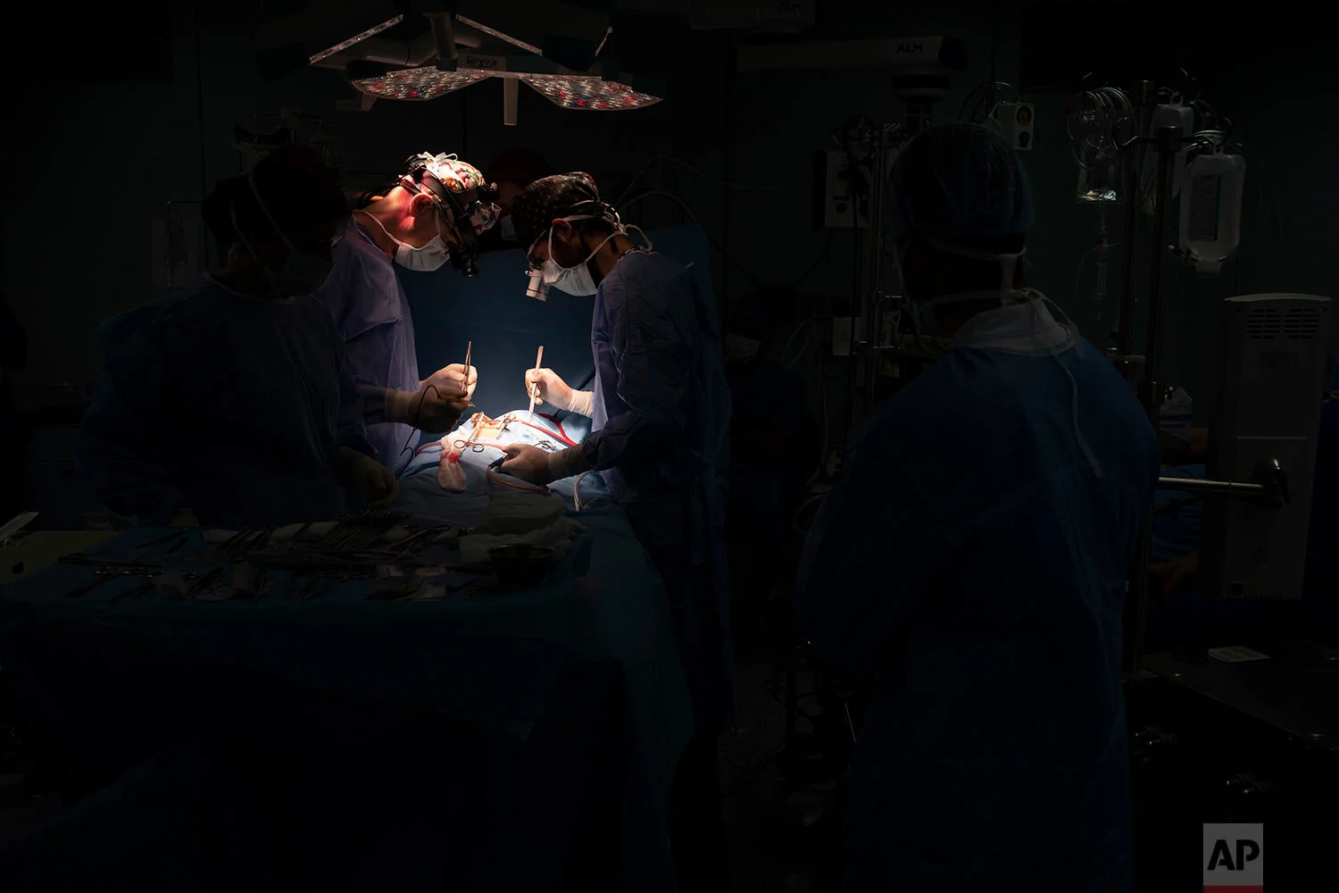 Dr. Vitaly Dedovich, center left, of the Novick Cardiac Alliance medical team performs open heart surgery on Yazan, 1, at the Tajoura National Heart Center in Tripoli, Libya, Feb. 27, 2020. (AP Photo/Felipe Dana)