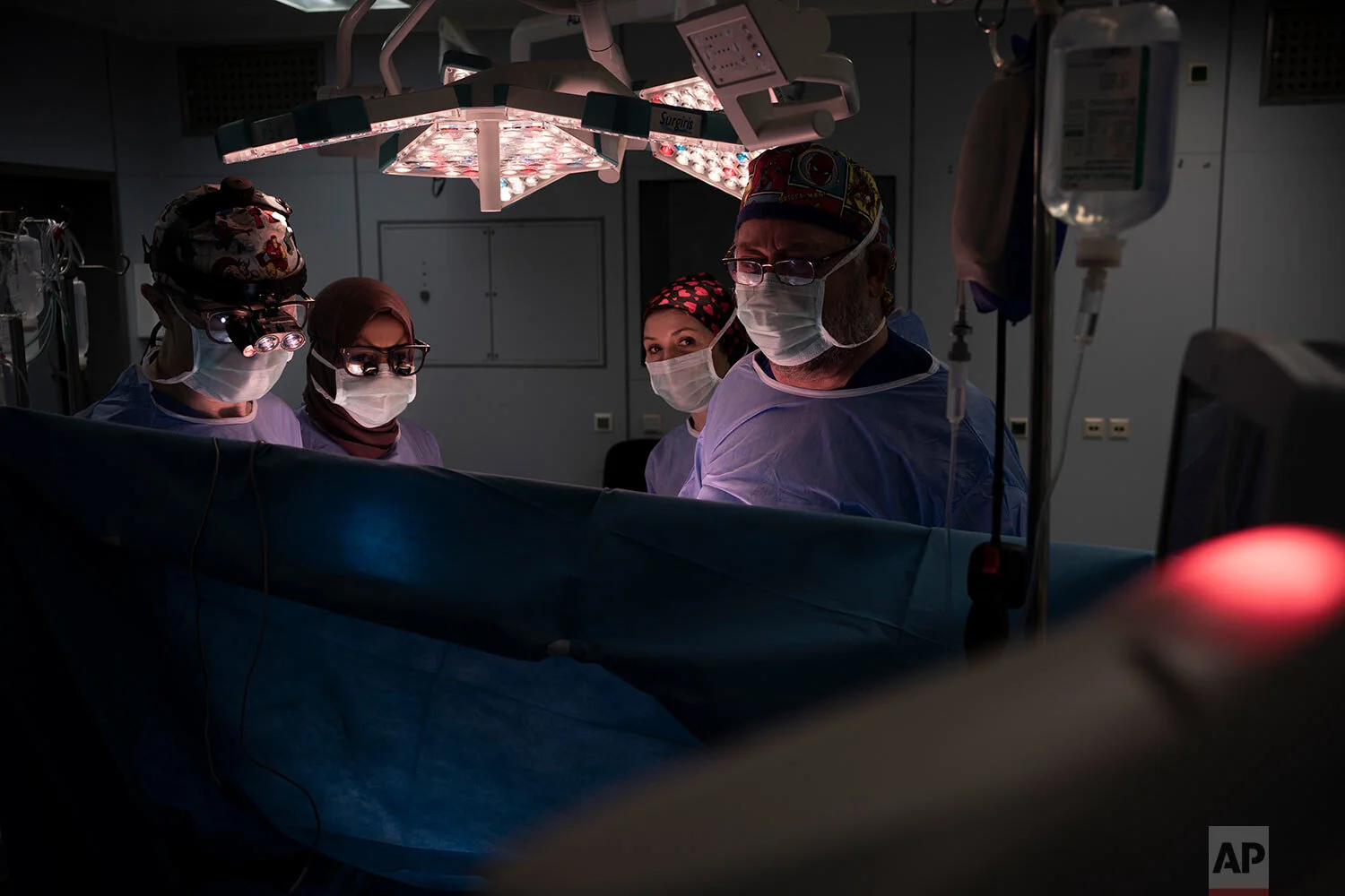 Dr. Vitaly Dedovich, right, of the Novick Cardiac Alliance medical team, performs open heart surgery at the Tajoura National Heart Center in Tripoli, Libya, Feb. 26, 2020. (AP Photo/Felipe Dana)