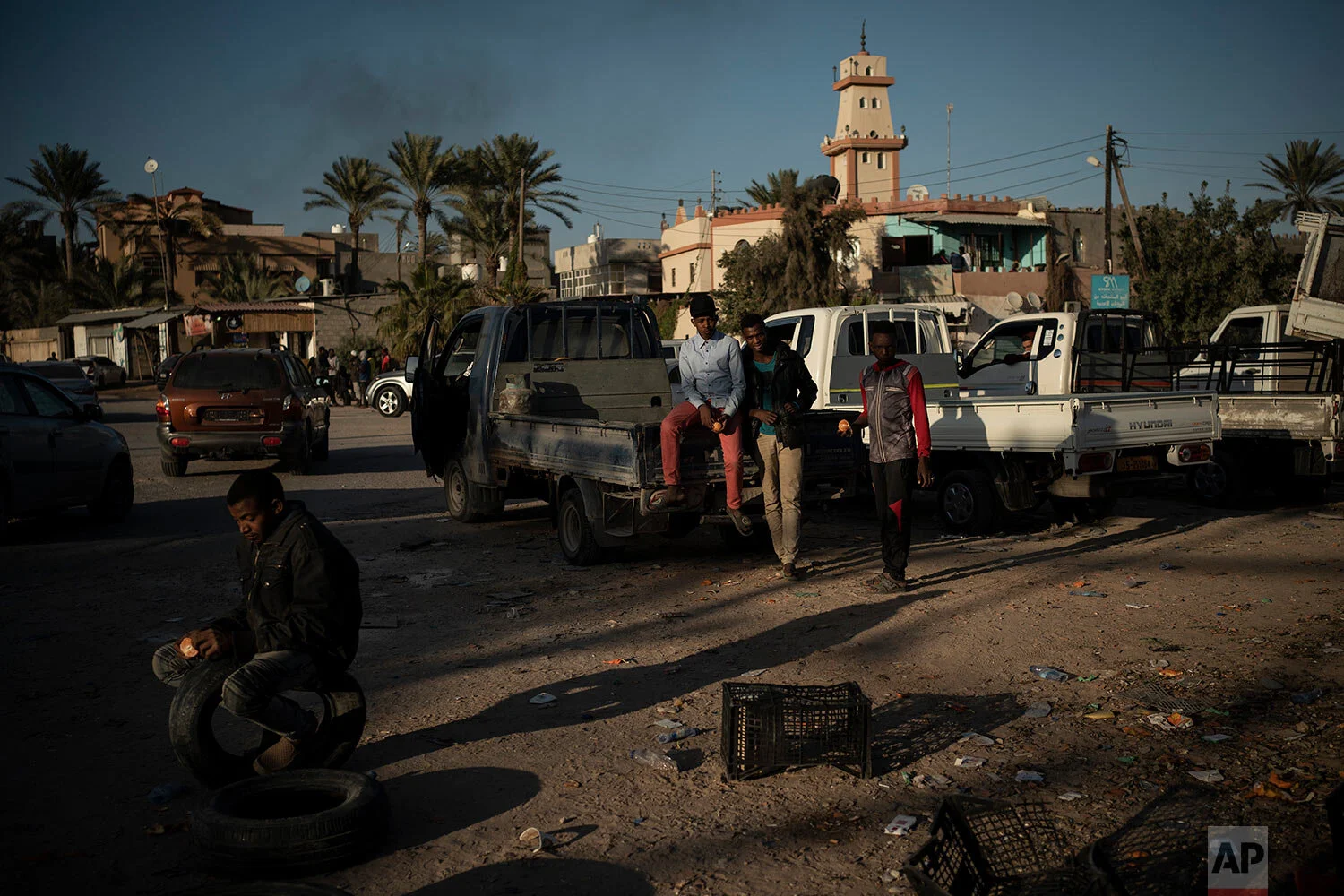 Migrants from Niger looking for jobs wait at an intersection in the outskirts of Tripoli, Libya, Feb. 27, 2020. (AP Photo/Felipe Dana)