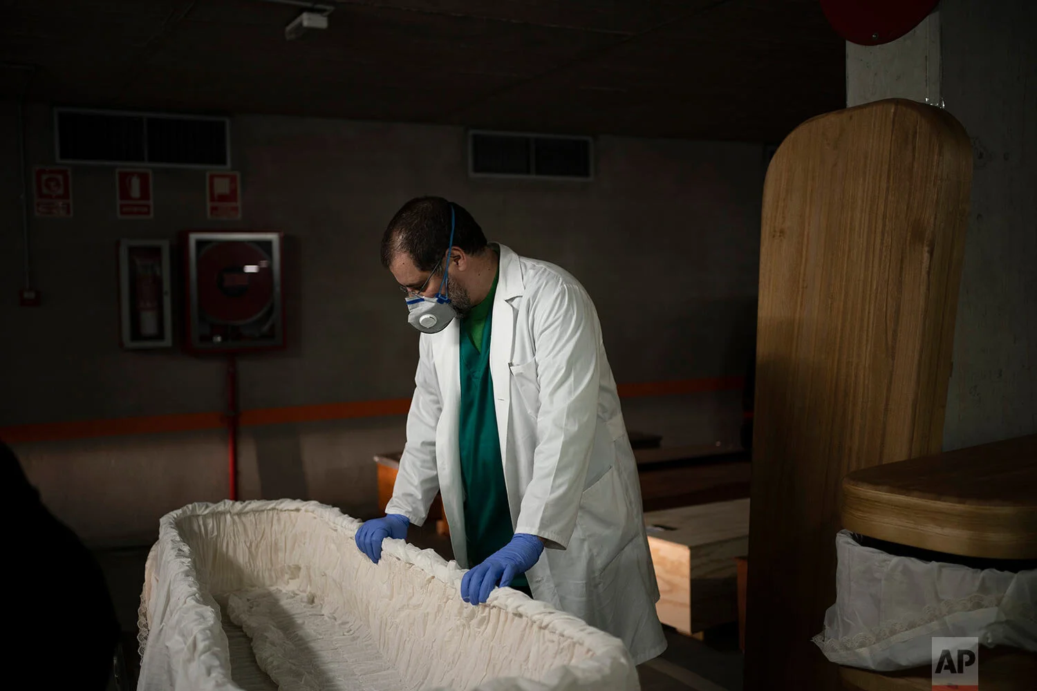 A mortician prepares the body of a person who died of causes unrelated to the new coronavirus at the Sancho de Avila Funeral Home in Barcelona, Spain, Tuesday, April 14, 2020. (AP Photo/Felipe Dana)