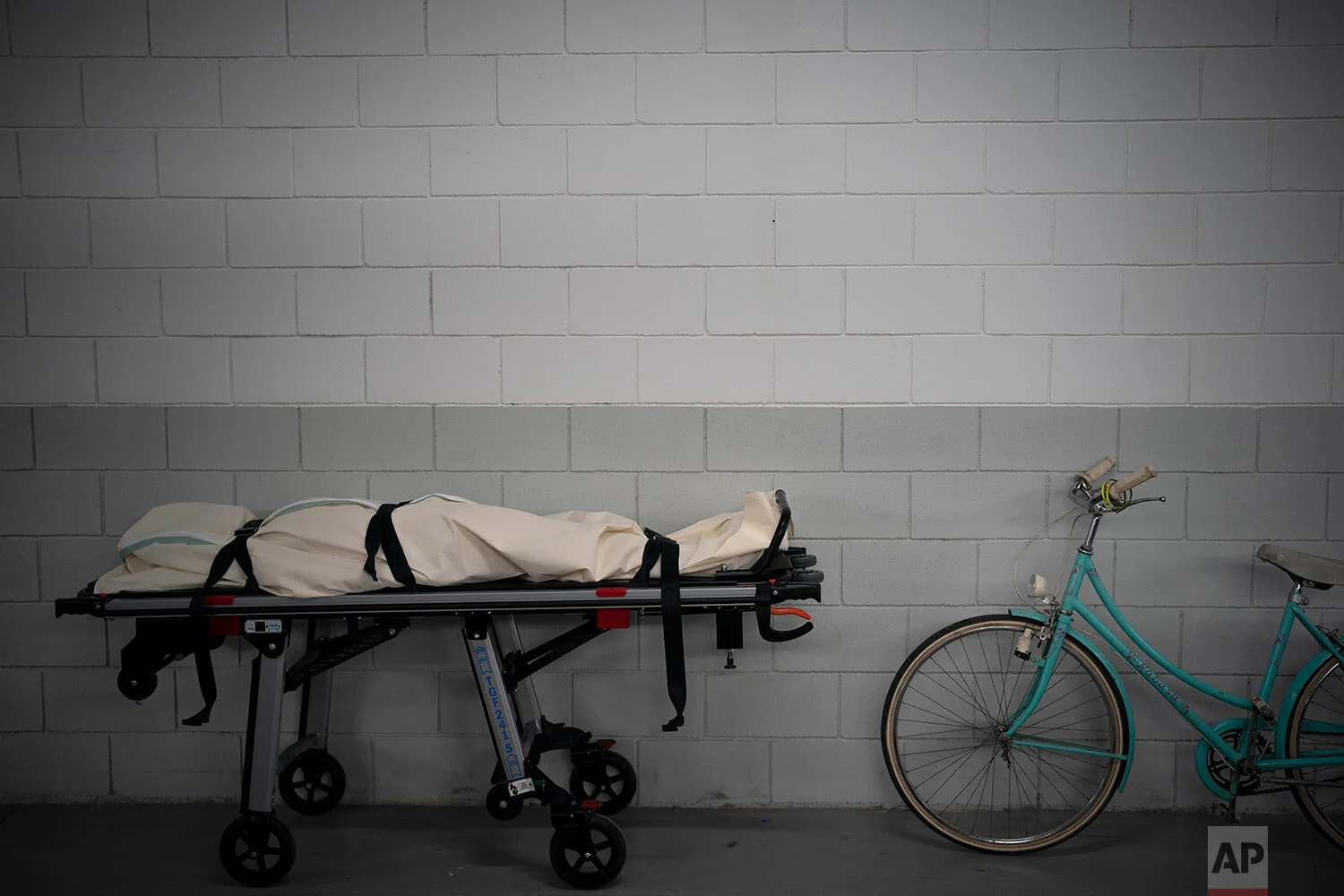 A body lays on a stretcher next to a bicycle before being prepared for cremation at a funeral home in Manresa, Barcelona province, Spain, Tuesday, April 14, 2020. (AP Photo/Felipe Dana)