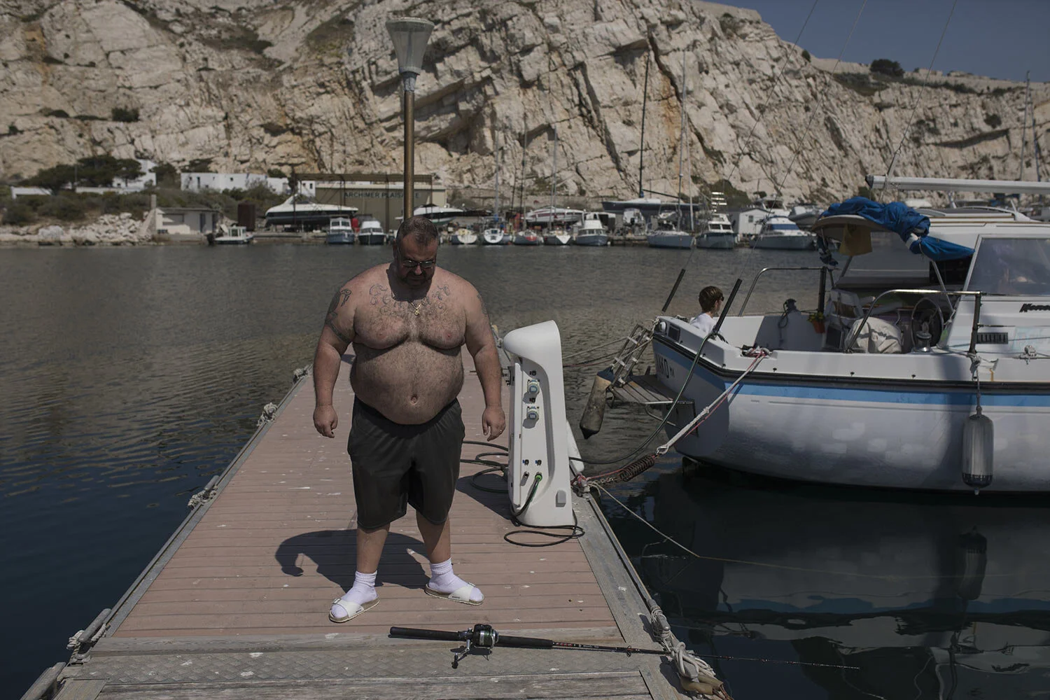 Guillaume Savalier fishes from the port where his boat is docked in Frioul, southern France, Friday, April 10, 2020. (AP Photo/Daniel Cole)