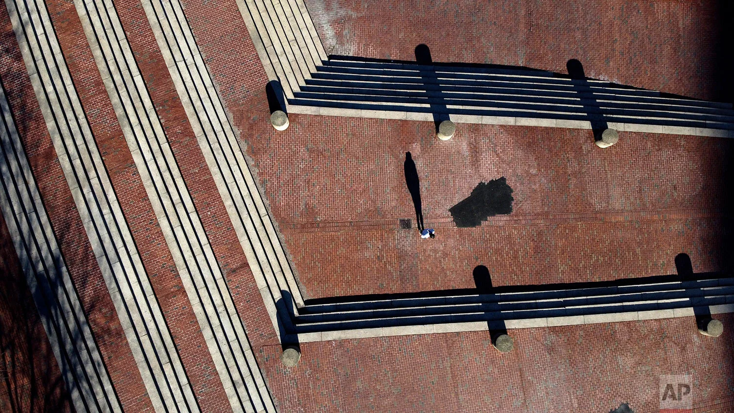 The late afternoon sun casts a long shadow of a lone pedestrian walking up the steps of City Hall Plaza, March 21, 2020, in Boston. (AP Photo/David Goldman)