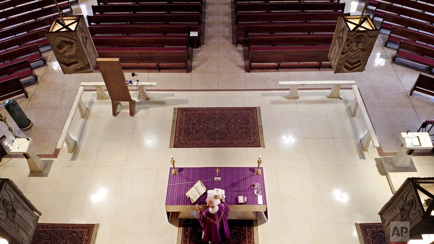 The Rev. Peter Gower holds his daily Mass before empty pews at Our Lady of Grace Catholic Church, March 29, 2020, in Johnston, R.I. (AP Photo/David Goldman)