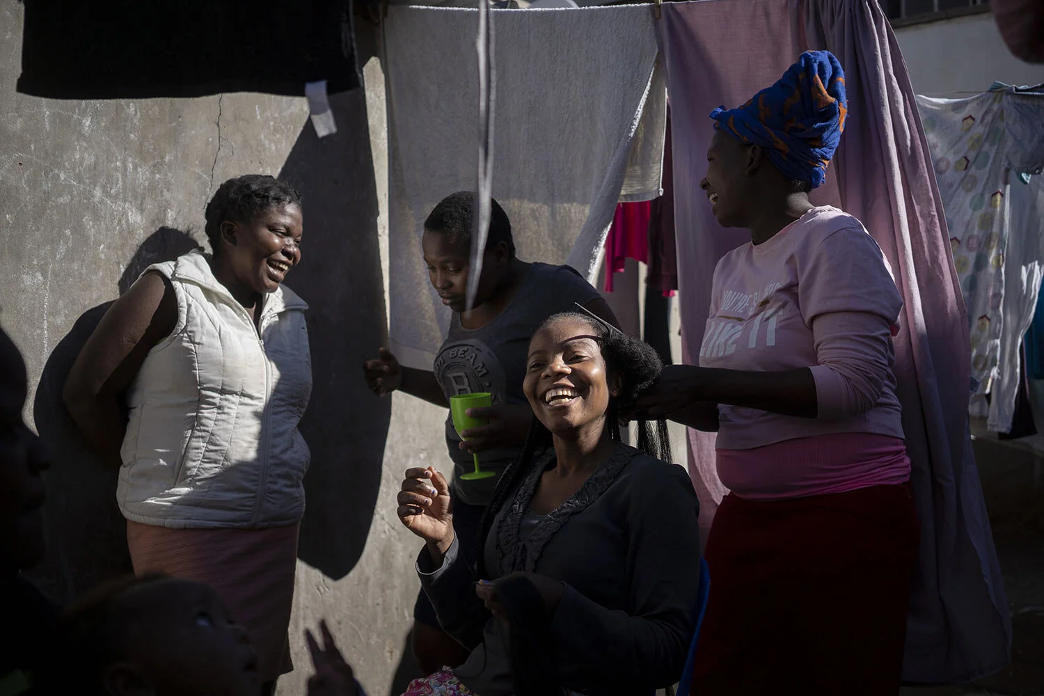 Fellowship Mukanhairi, the daughter of a blind Zimbabwean migrant, has her hair styled in the courtyard of their building in Johannesburg, South Africa on April 16, 2020. (AP Photo/Bram Janssen)