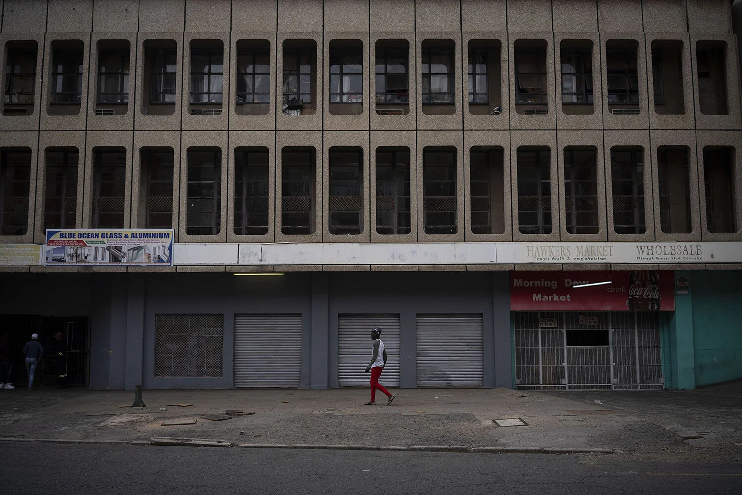 A man walks past a building where blind and disabled migrants live in downtown Johannesburg, South Africa on April 14, 2020. The country is under a strict five-week lockdown, in which its 57-million residents are ordered to to stay at home except for visits to grocery stores, pharmacies and doctors. (AP Photo/Bram Janssen)