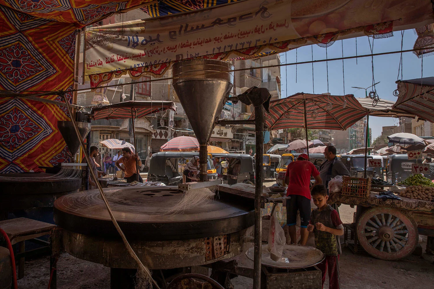 The market in Manfalut, a town 350 kilometers (230 miles) south of Cairo, has remained open throughout the pandemic, bustling as shoppers buy provisions for the evening meal that breaks the daily fast during the Islamic holy month of Ramadan. The small pancakes that Mahmoud makes, called qatayef in Arabic, are among the most favorite Ramadan desserts.