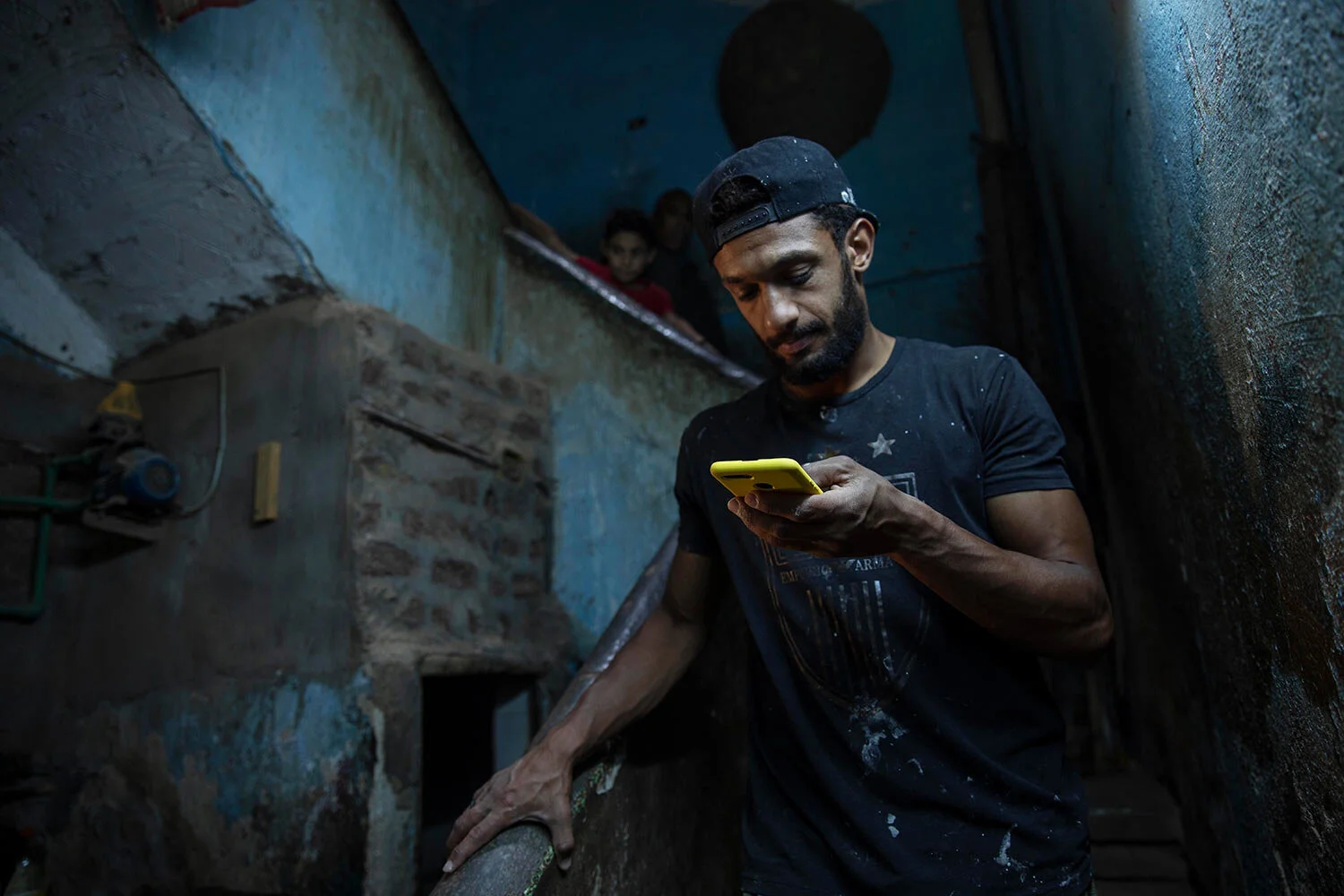 In this May 9, 2020 photo, 28-year-old football defender Mahrous Mahmoud, stops to look at his phone as he walks down the stairs of the building where he lives, in Manfalut, a town 350 kilometers (230 miles) south of Cairo in the province of Assiut, Egypt. (AP Photo/Nariman El-Mofty)