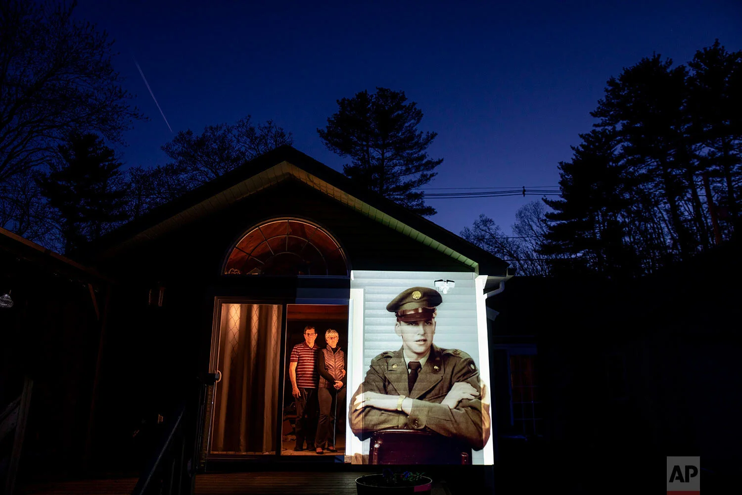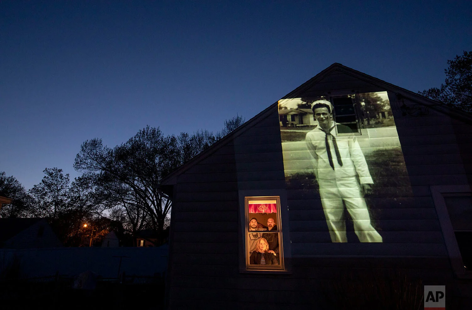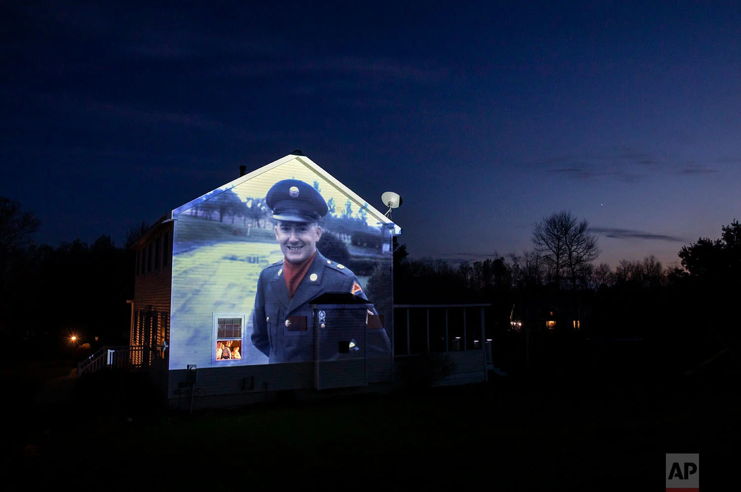 An image of veteran Stephen Kulig is projected onto the home of his daughter, Elizabeth DeForest, as she looks out the window of a spare bedroom as her husband, Kevin, sits downstairs. After saying goodbye to her father for the last time in person, Elizabeth slept in the spare bedroom upstairs for two weeks as a precaution against possibly infecting her husband. (AP Photo/David Goldman)