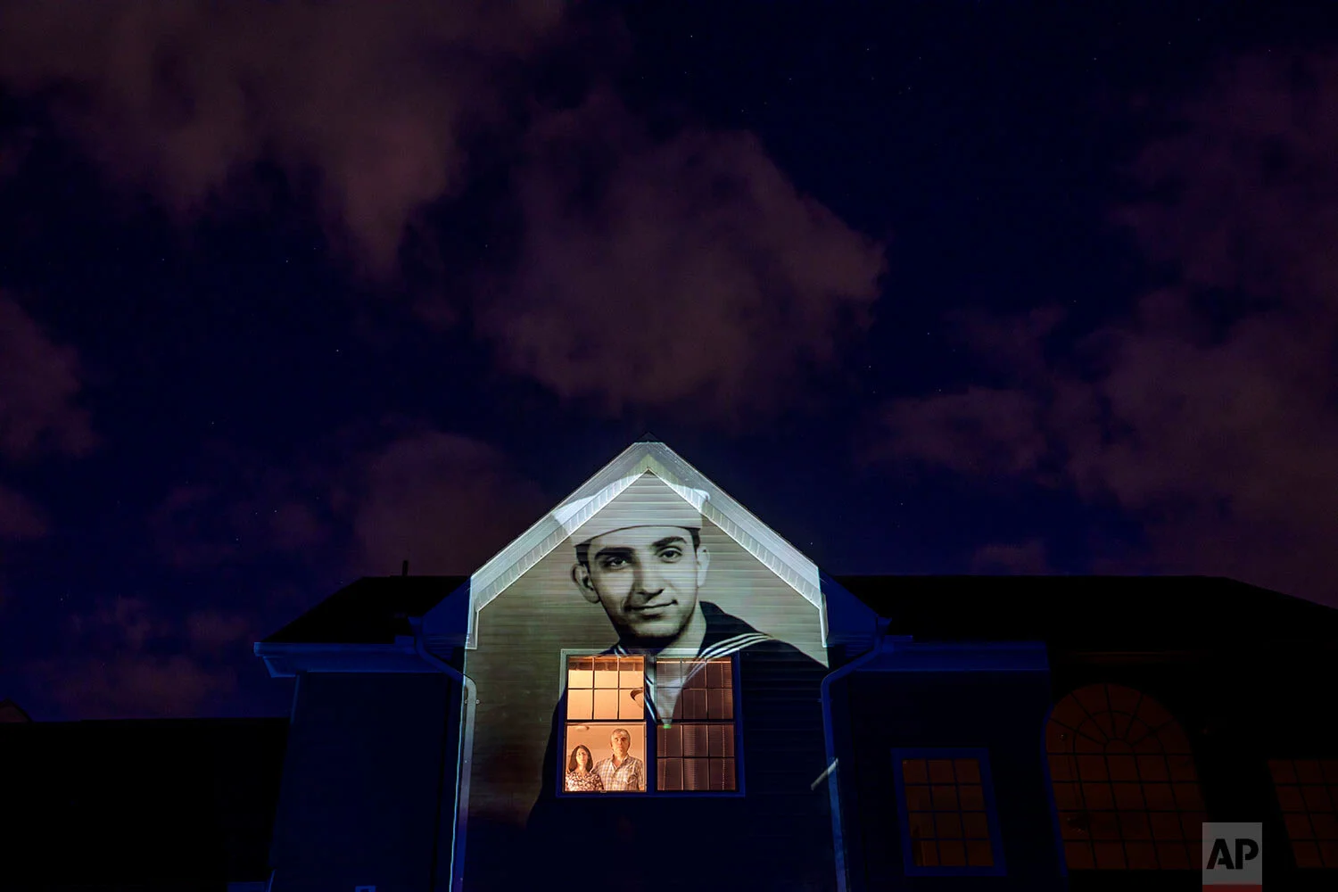 An image of veteran Harry Malandrinos is projected onto the home of his son, Paul Malandrinos, as he looks out a window with his wife Cheryl. (AP Photo/David Goldman)