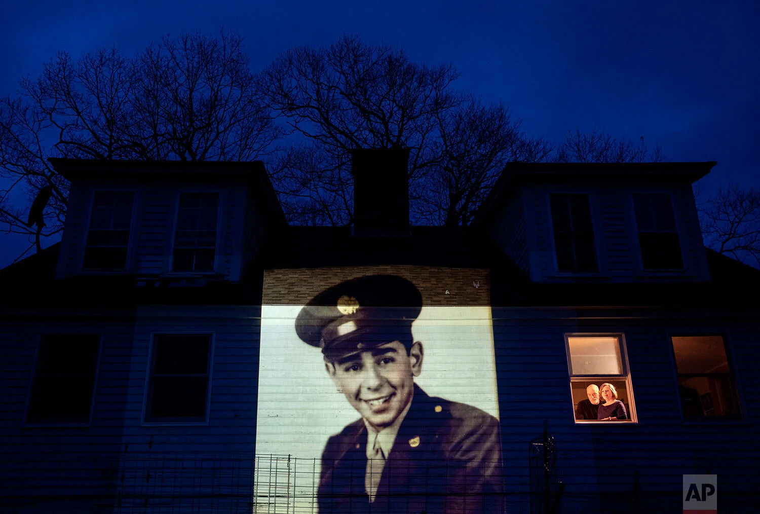 An image of veteran Emilio DiPalma is projected onto the home of his daughter, Emily Aho as she looks out a window with her husband, George. (AP Photo/David Goldman)