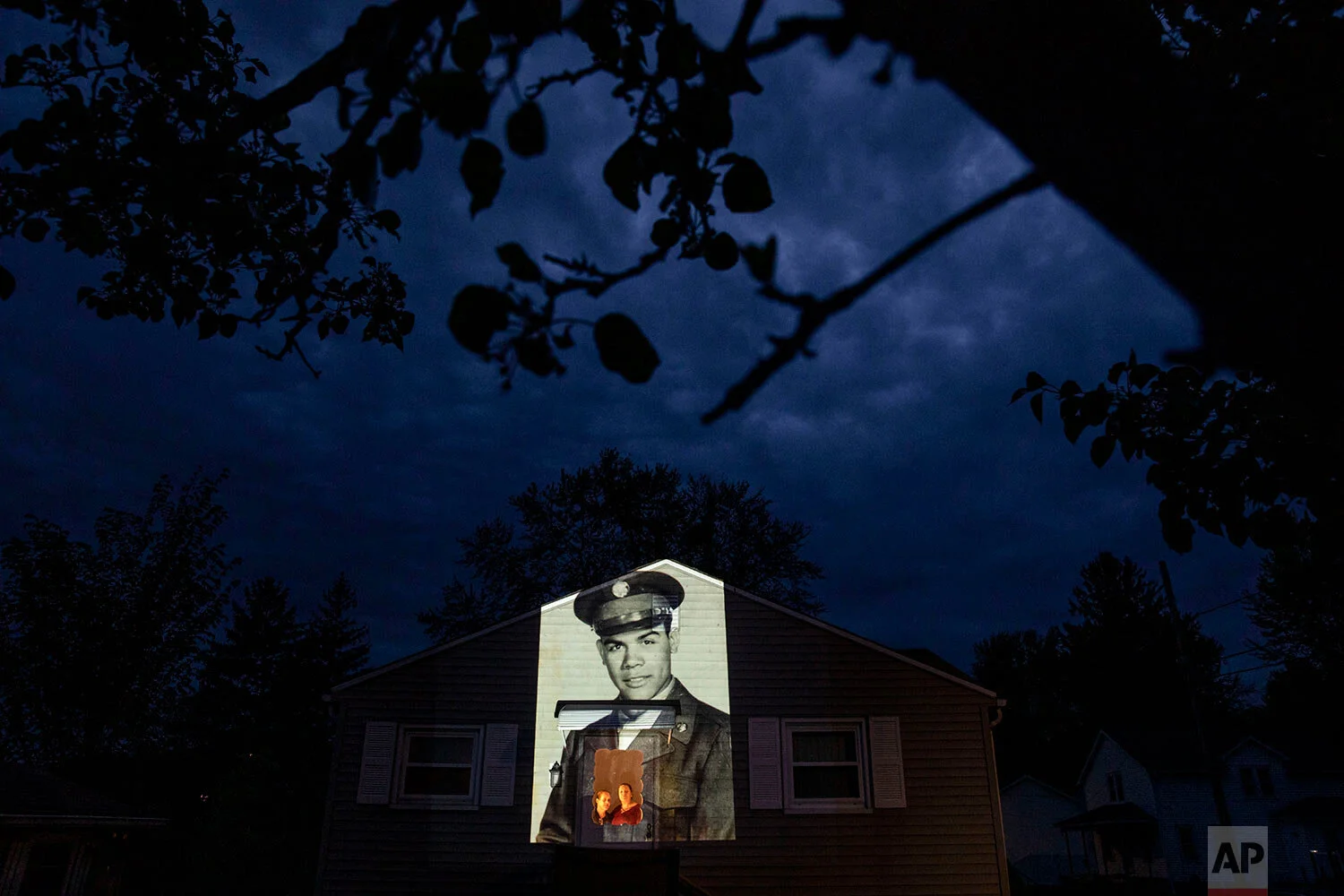 An image of veteran Roy Benson is projected onto the home of his daughter, Robin Benson Wilson, left, as she looks out a doorway with her husband, Donald. (AP Photo/David Goldman)