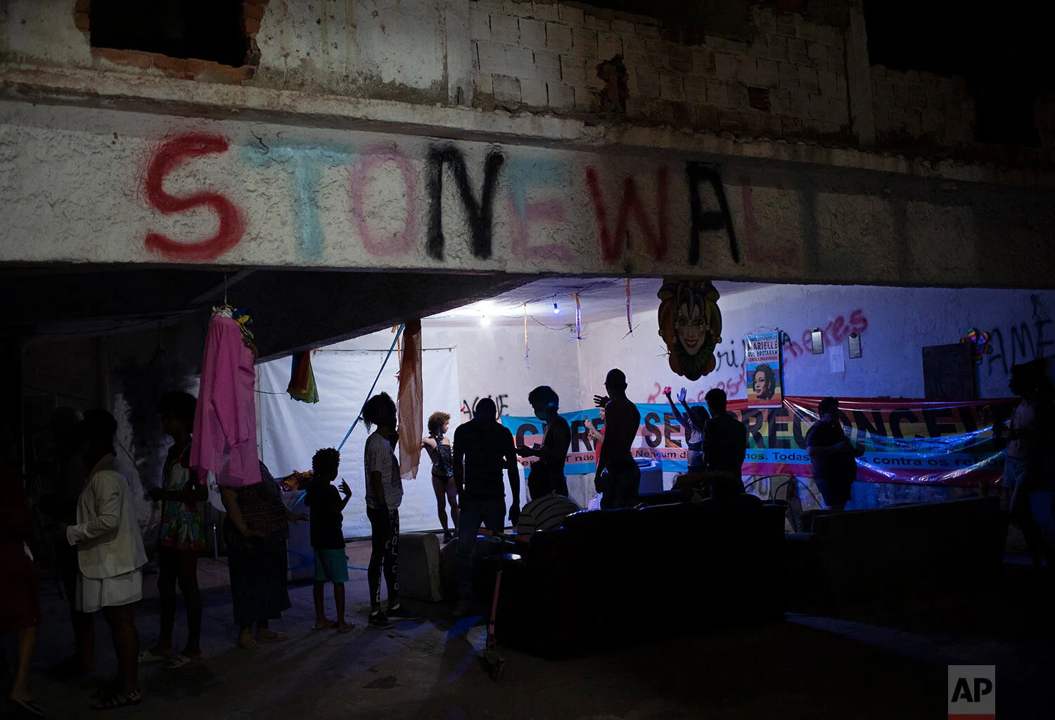 Members of the LGBTQ community gather in the courtyard of the squat known as Casa Nem to watch the weekly presentations by residents on a makeshift stage, in Rio de Janeiro, Brazil, Saturday, May 23, 2020. (AP Photo/Silvia Izquierdo)