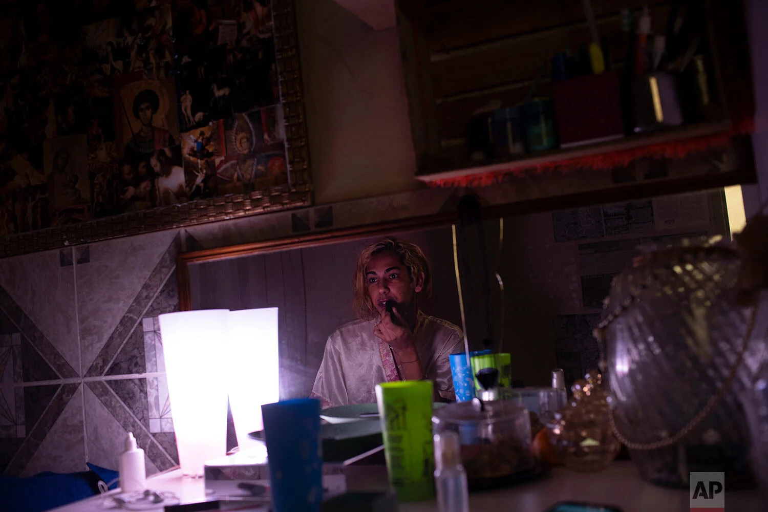 Alex looks into a mirror as she puts on lipstick in her room at the squat known as Casa Nem in Rio de Janeiro, Brazil, Wednesday, July 8, 2020. (AP Photo/Silvia Izquierdo)