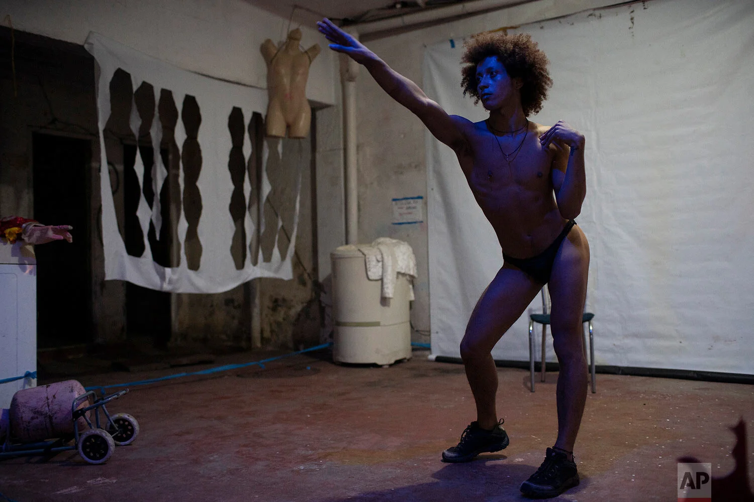 Crystal performs against racism and discrimination in one of the weekly presentations put on by residents on a makeshift stage in the squat known as Casa Nem, occupied by members of the LGBTQ community who are in self-quarantine as a protective measure against the new coronavirus, in Rio de Janeiro, Brazil, Saturday, May 23, 2020. (AP Photo/Silvia Izquierdo)