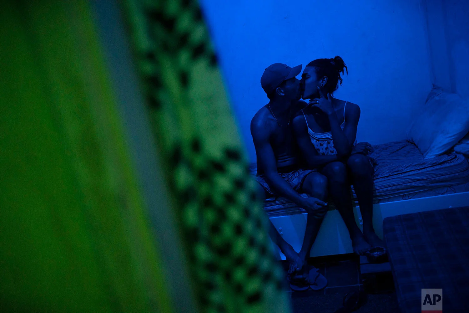 Richard Santos and his partner Lia kiss in their bedroom in the squat known as Casa Nem, occupied by members of the LGBTQ community who are in self-quarantine as a protective measure against the new coronavirus, in Rio de Janeiro, Brazil, Saturday, May 23, 2020. (AP Photo/Silvia Izquierdo)