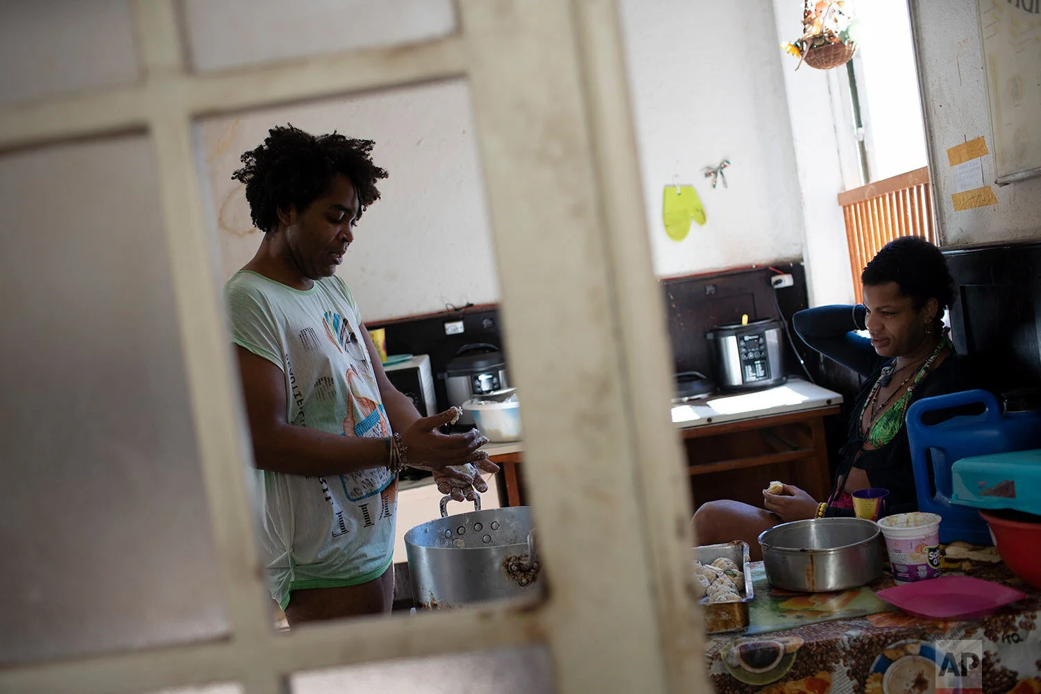 Morgana keeps Micaela company as she prepares rice balls for lunch in the kitchen of the squat known as Casa Nem, occupied by members of the LGBTQ community who are in self-quarantine as a protective measure against the new coronavirus, in Rio de Janeiro, Brazil, Wednesday, July 8, 2020. (AP Photo/Silvia Izquierdo)
