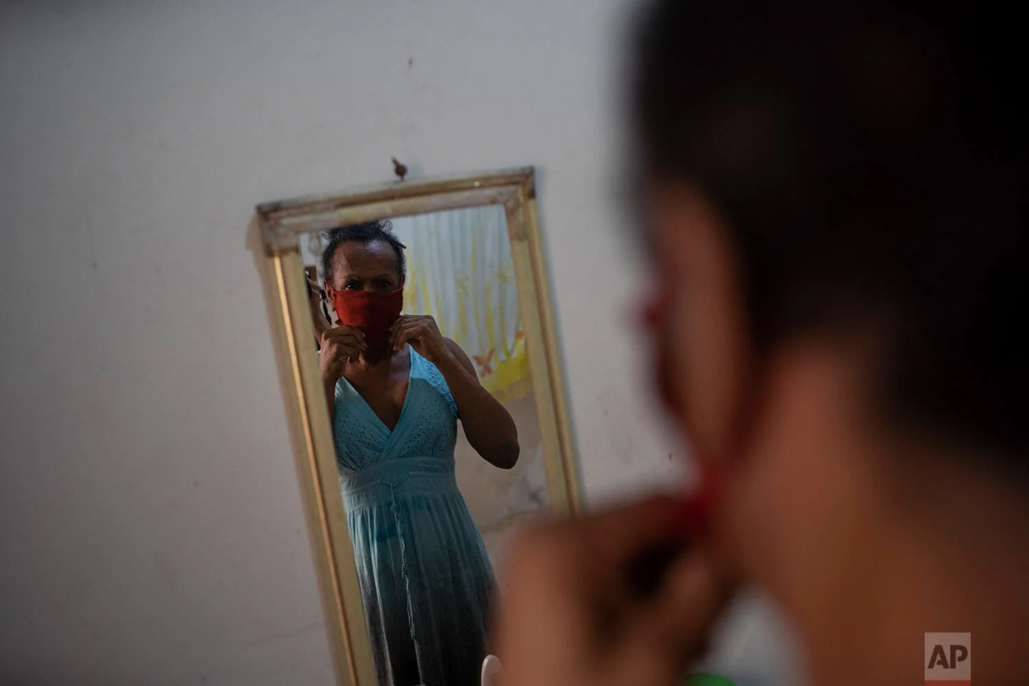 Claudinha, who is transgender, is reflected in a mirror as she puts on a protective face mask inside her room at the squat known as Casa Nem, in Rio de Janeiro, Brazil, Wednesday, July 8, 2020. (AP Photo/Silvia Izquierdo)