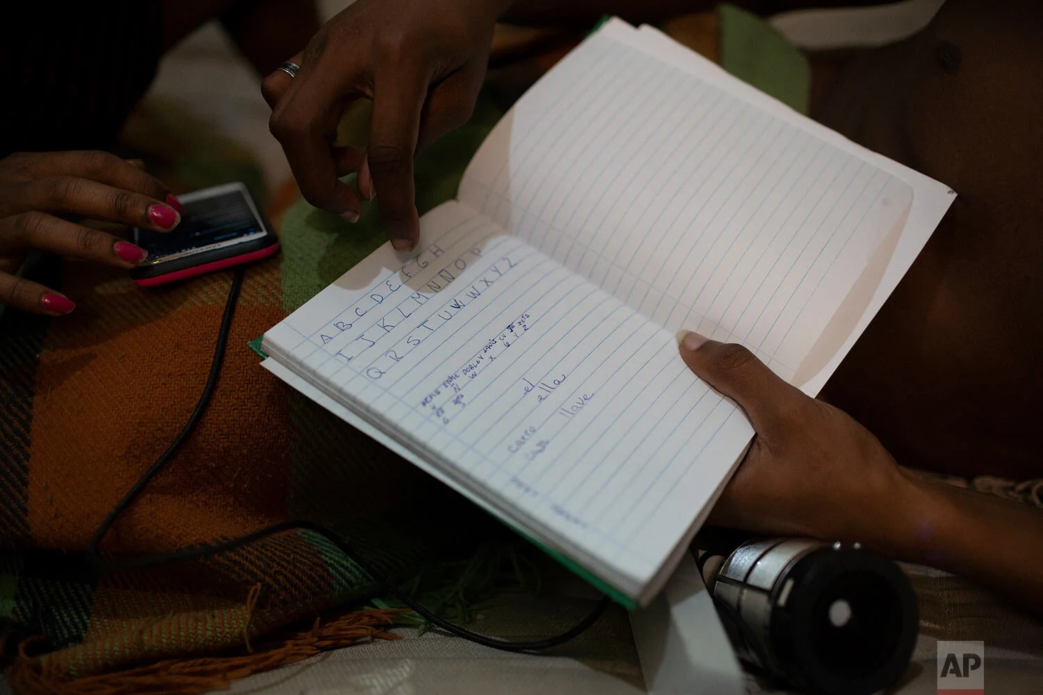 Marshall shows his Spanish lesson to fellow resident Klay, at the squat known as Casa Nem in Rio de Janeiro, Brazil, Wednesday, July 8, 2020. (AP Photo/Silvia Izquierdo)