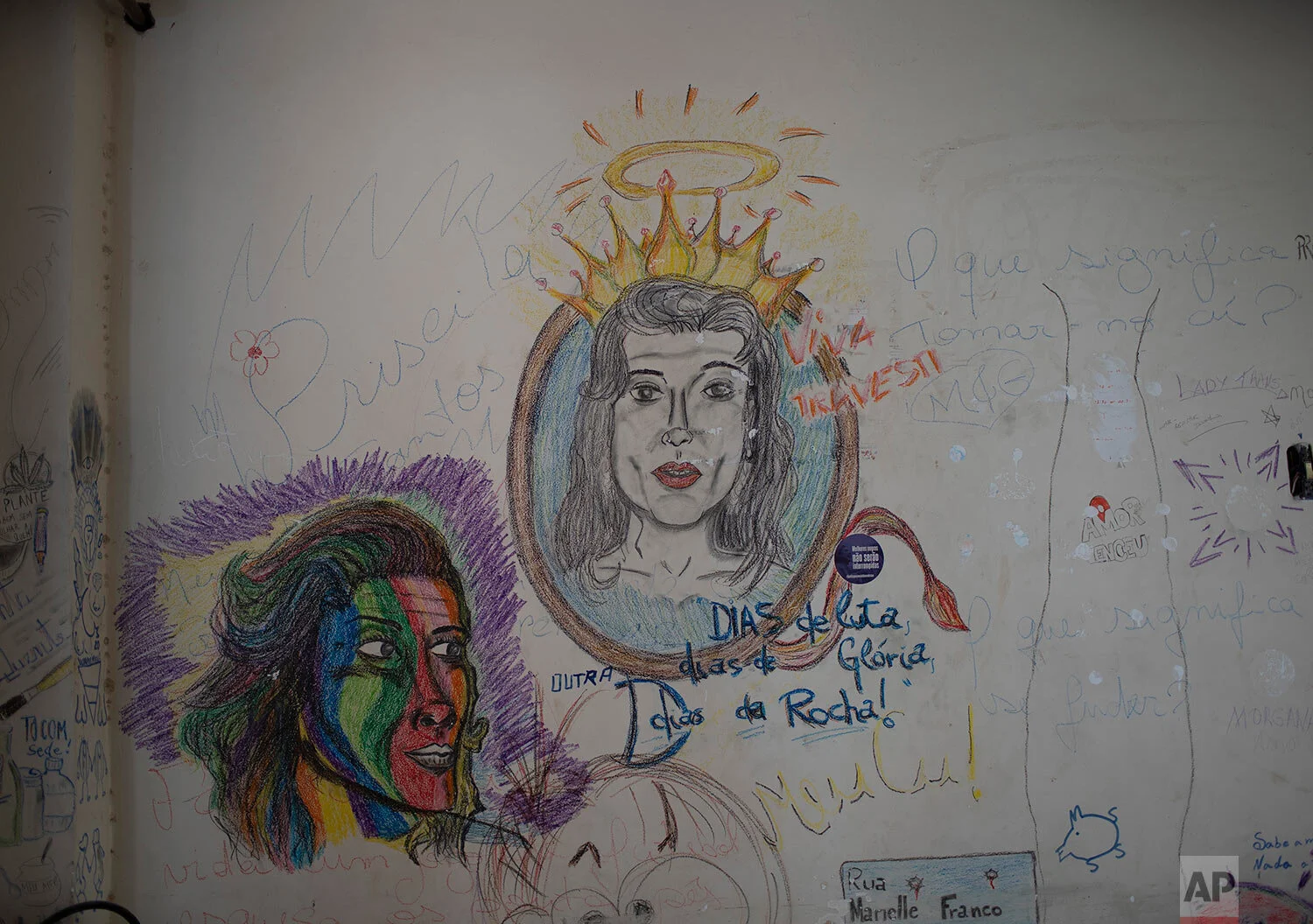 Drawings and messages honoring the transgender community decorate a wall of at the squat known as Casa Nem, occupied by members of the LGBTQ community who are in self-quarantine as a protective measure against the new coronavirus, in Rio de Janeiro, Brazil, Friday, May 29, 2020. (AP Photo/Silvia Izquierdo)