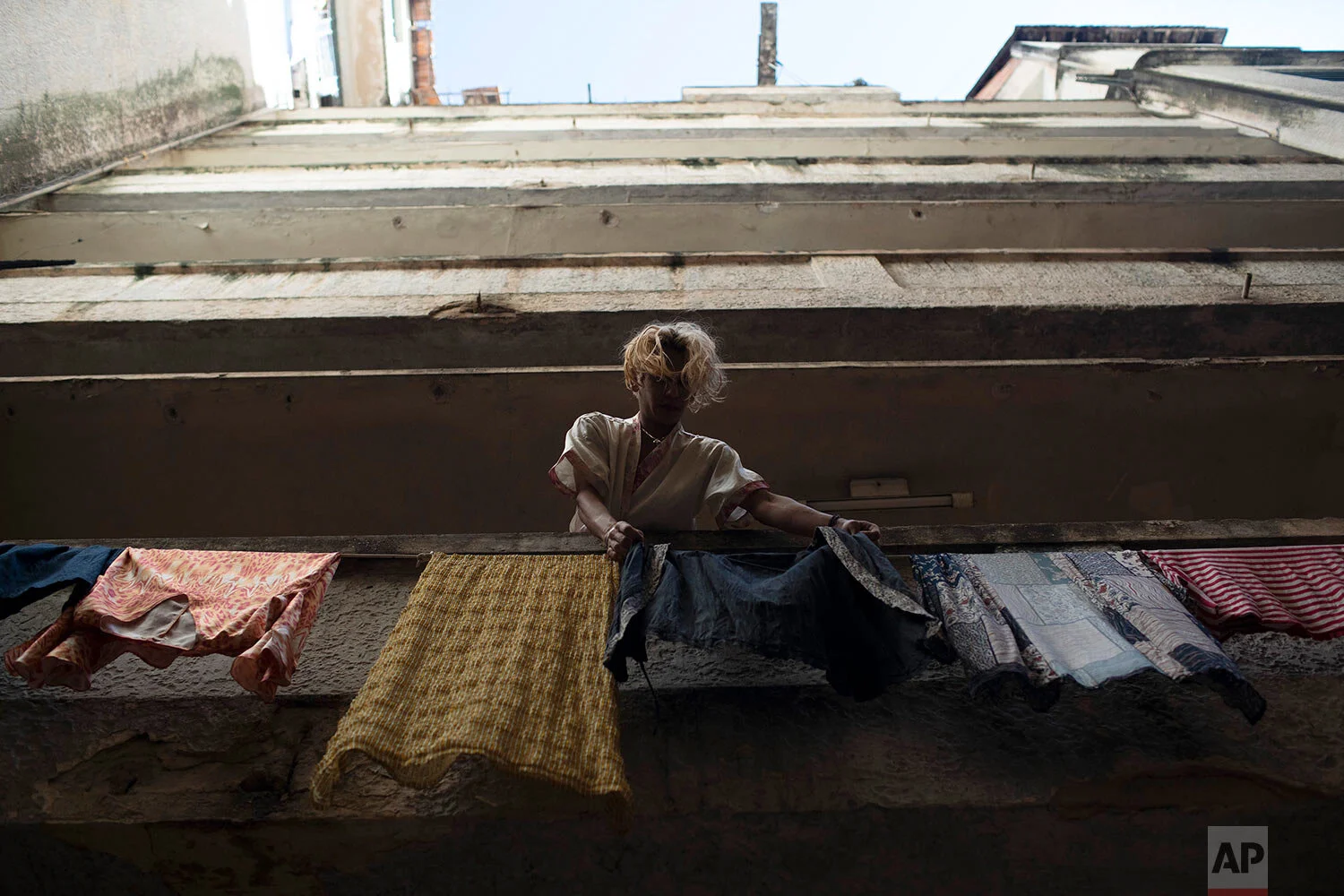 Alex, who is transgender, hangs clothes out to dry at the squat known as Casa Nem in Rio de Janeiro, Brazil, Wednesday, July 8, 2020. (AP Photo/Silvia Izquierdo)