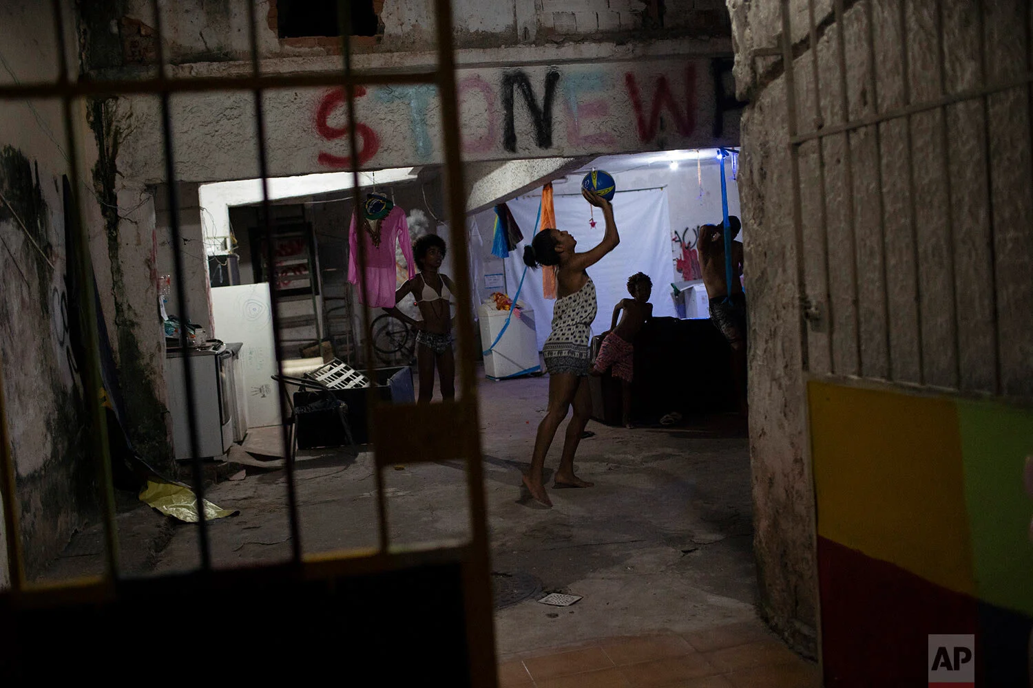 Residents play basketball at the squat known as Casa Nem, occupied by members of the LGBTQ community who are in self-quarantine as a protective measure against the new coronavirus, in Rio de Janeiro, Brazil, Friday, May 29, 2020. (AP Photo/Silvia Izquierdo)