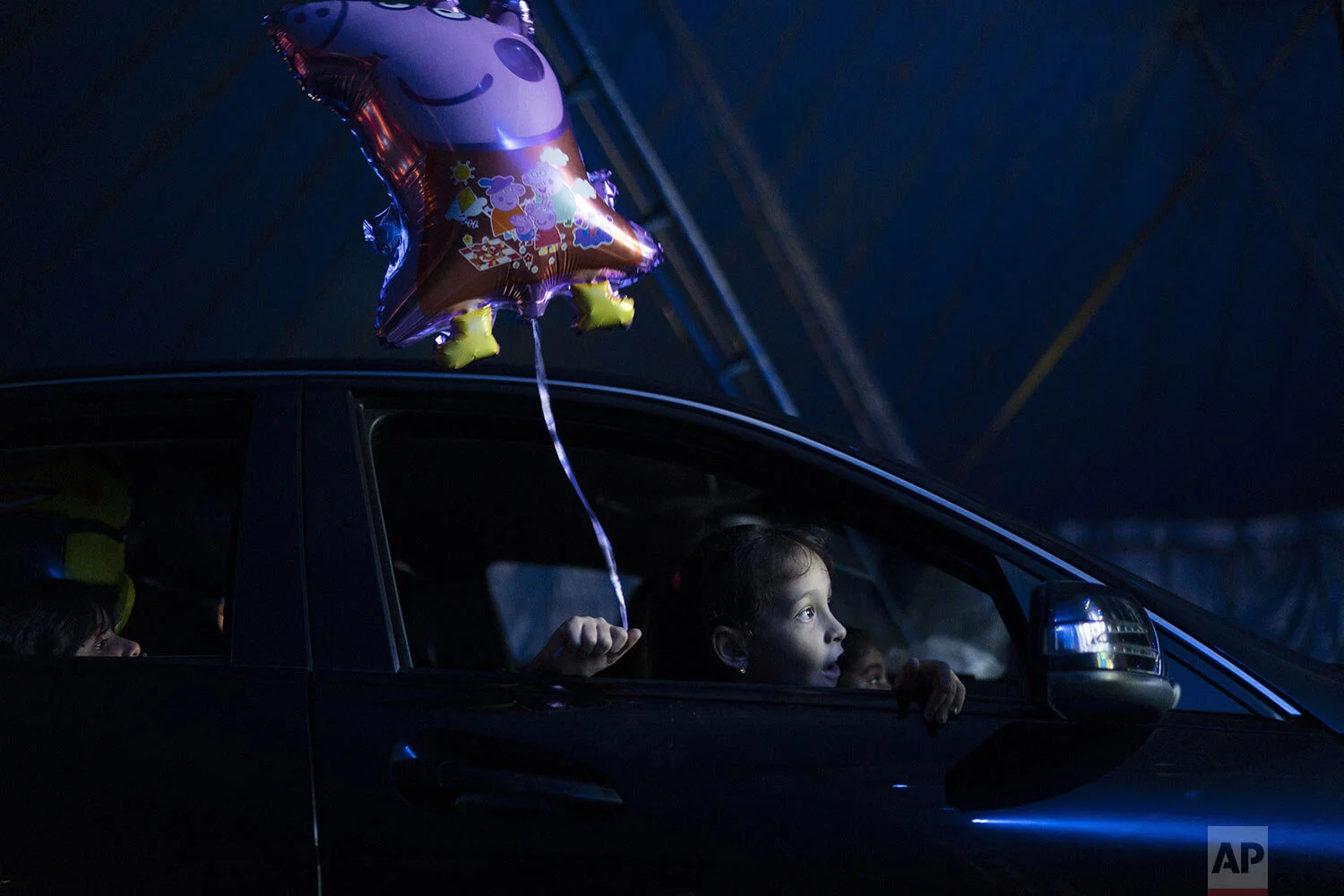 A girl watches artists perform at the Estoril Circus drive-in show in Itaguai, greater Rio de Janeiro, Brazil, July 18, 2020. (AP Photo/Leo Correa)