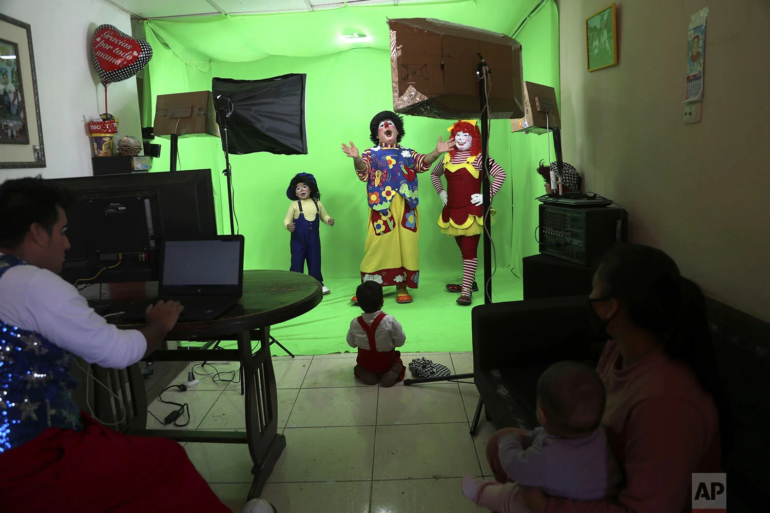 Other clowns are trying to adapt to the pandemic confinement. Carlos Olazábal and his four children perform children’s shows using video calls from their four-story house. His family also sells apples and salty popcorn to bring in an income.