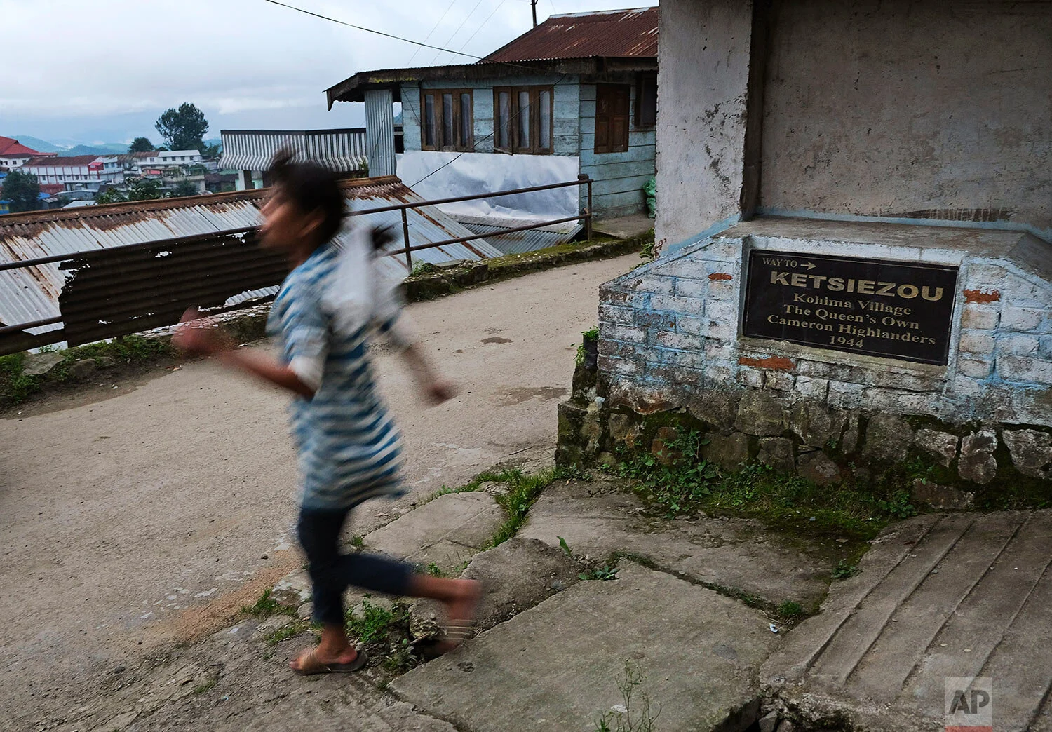 A Naga girl runs down a lane with a plaque planted by the British commemorating the Queens Own Cameron Highlanders, an infantry regiment of the British Army, in Kohima village, the site of a bloody WWII battle, India, Tuesday, Aug. 11, 2020. (AP Photo/Yirmiyan Arthur)