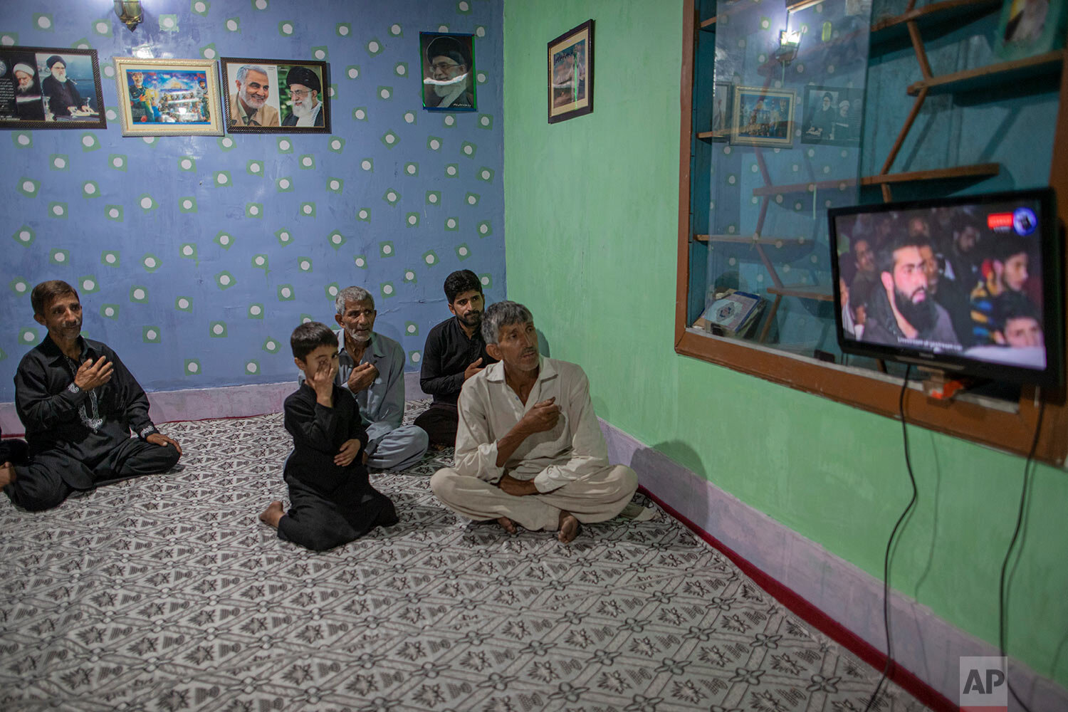 Kashmiri Shiite Muslims beat their chest as they watch religious broadcast on cable television to commemorate Muharram inside a residential house in the interiors of Dal Lake in Srinagar, Indian controlled Kashmir, Aug. 24, 2020. (AP Photo/Dar Yasin)