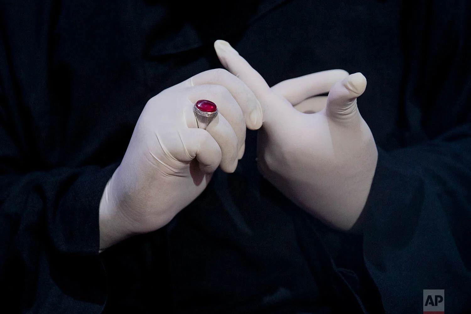 Zakir Tasaduk Hussain, a Kashmiri Shiite elegy reciter, wears surgical gloves as he gets ready for the ceremony to commemorate Muharram inside a residential house in the interiors of Dal Lake in Srinagar, Indian controlled Kashmir, Aug. 23, 2020. (AP Photo/Dar Yasin)