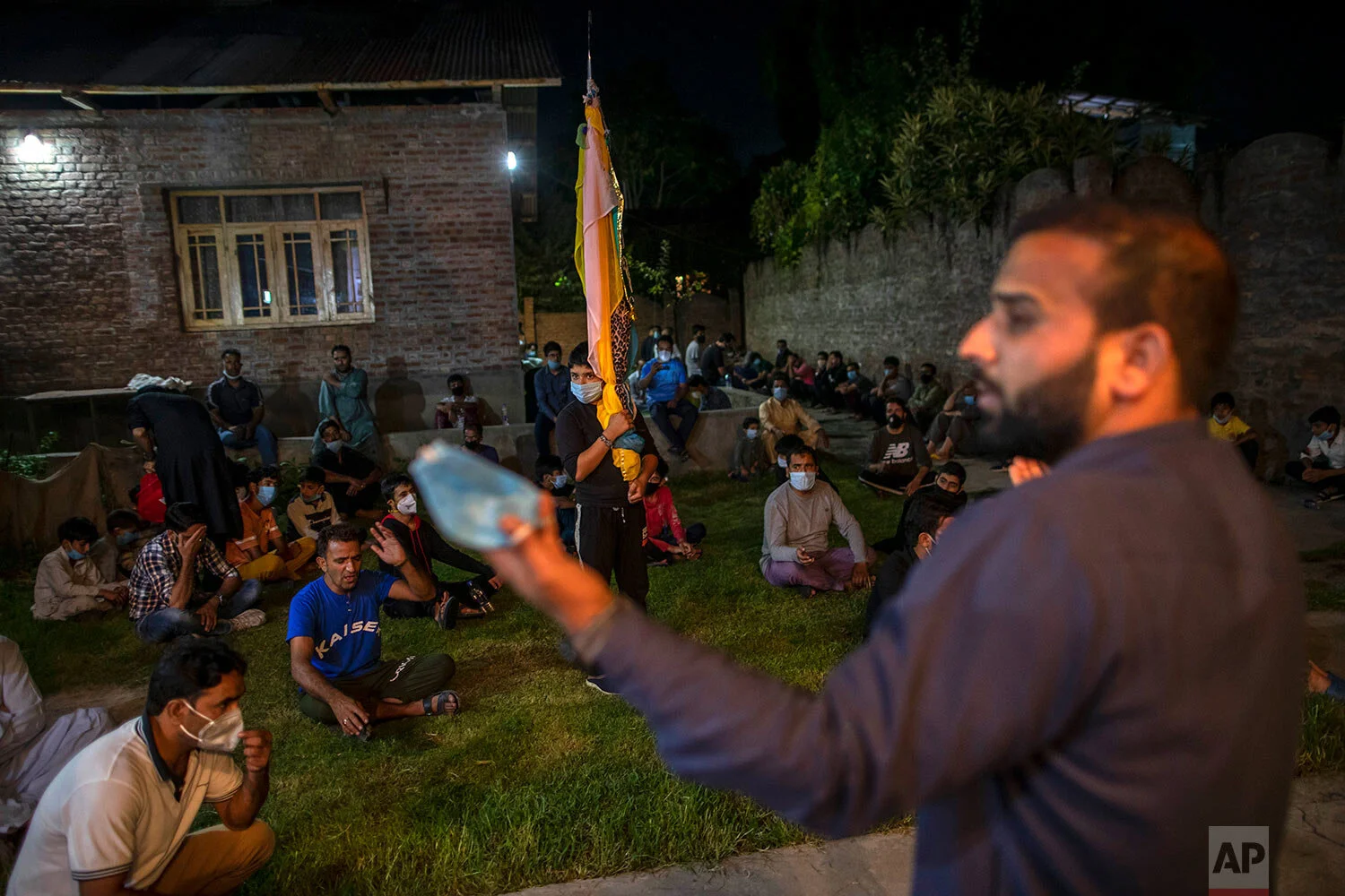 Kashmiri Shiite Muslims listen to an elegy reciter as they commemorate Muharram inside the lawn of a residential house in Srinagar Indian-controlled Kashmir, Aug. 21, 2020. (AP Photo/Dar Yasin)
