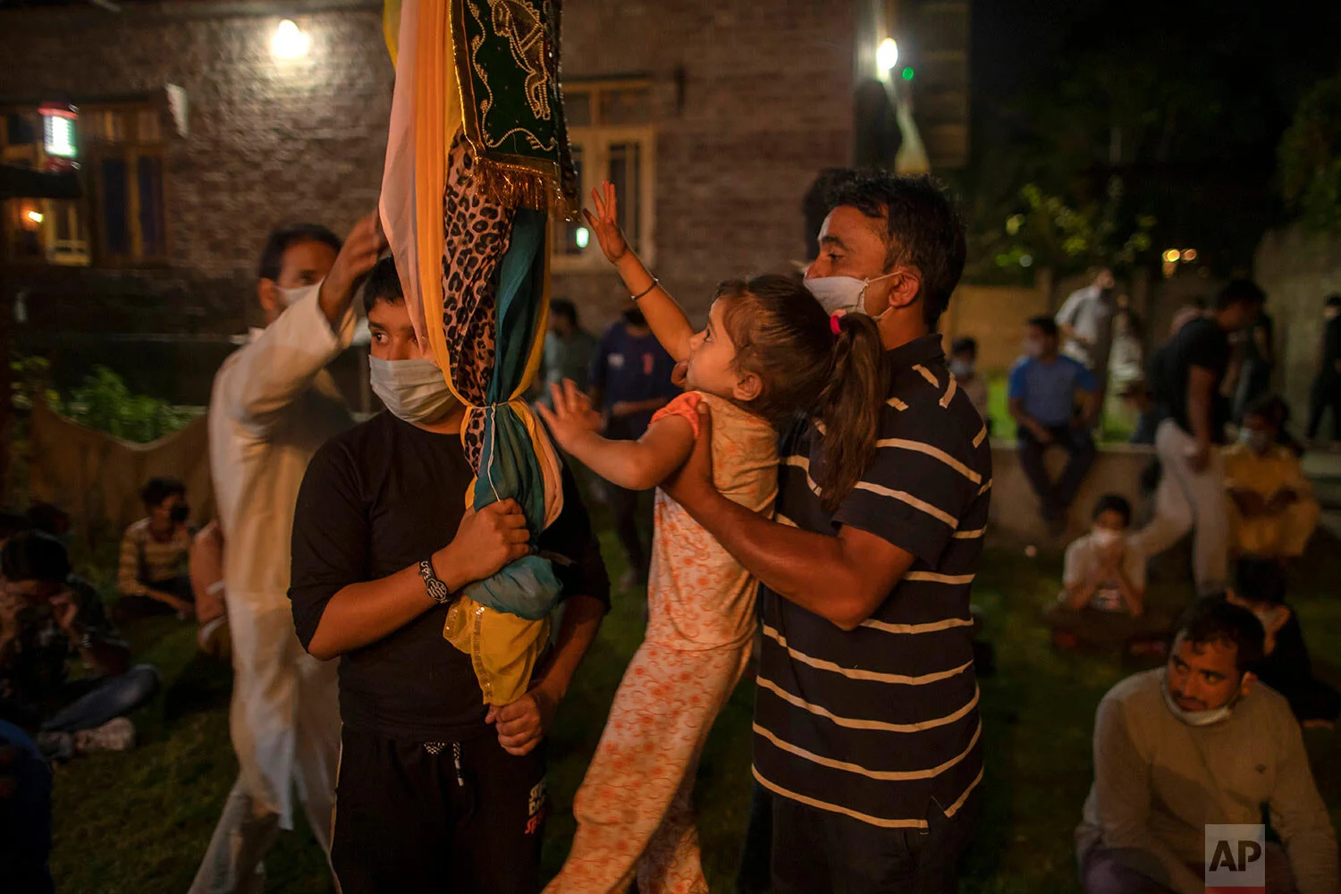A Kashmiri Shiite Muslim helps her daughter to touch the religious flag at of the ceremony commemorating Muharram inside the lawn of a residential house in Srinagar Indian-controlled Kashmir, Aug. 21, 2020. (AP Photo/ Dar Yasin)