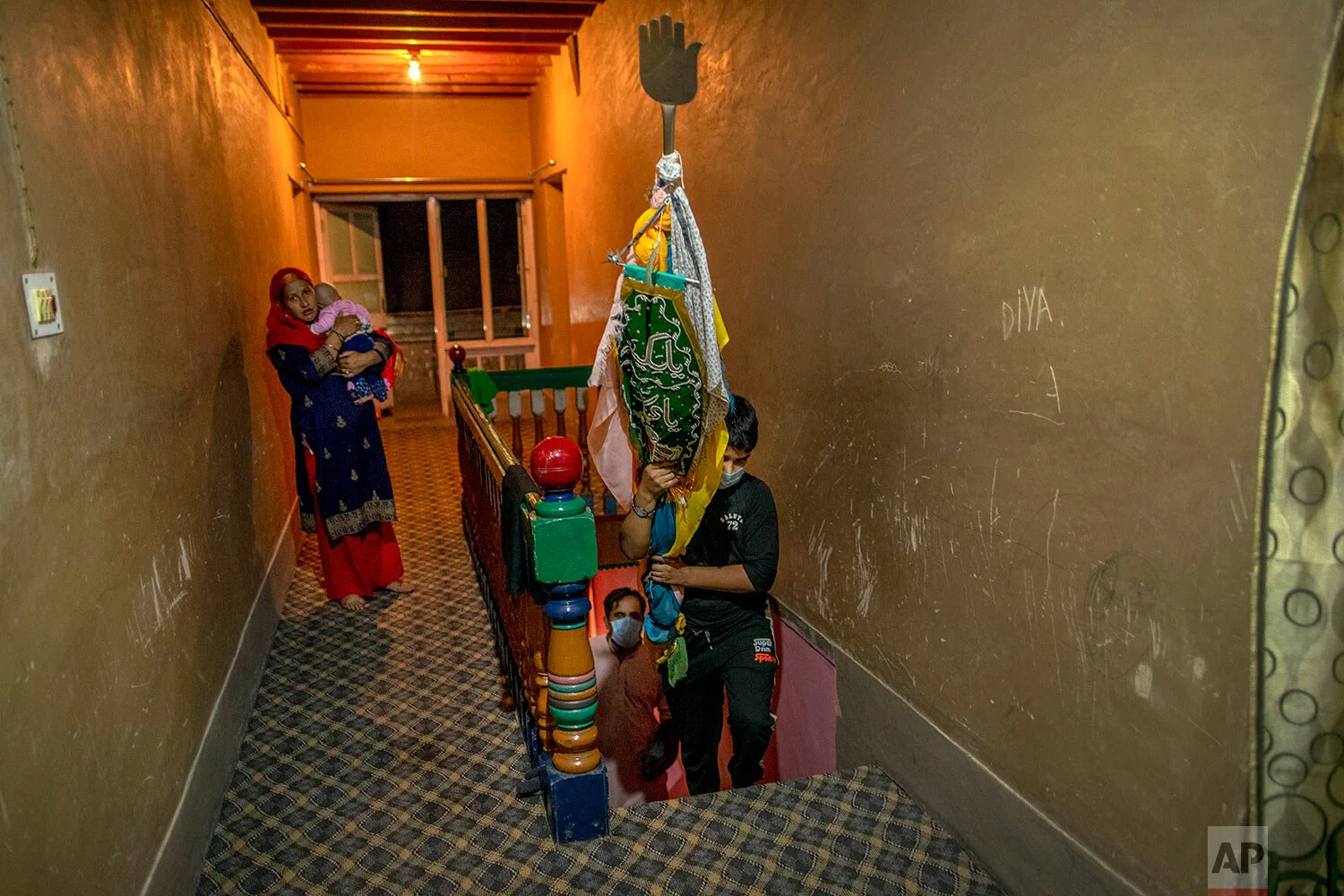 A Kashmiri Shiite Muslim boy brings back religious flag to his home after taking part in commemoration of Muharram in Srinagar Indian-controlled Kashmir, Aug. 21, 2020. (AP Photo/Dar Yasin)