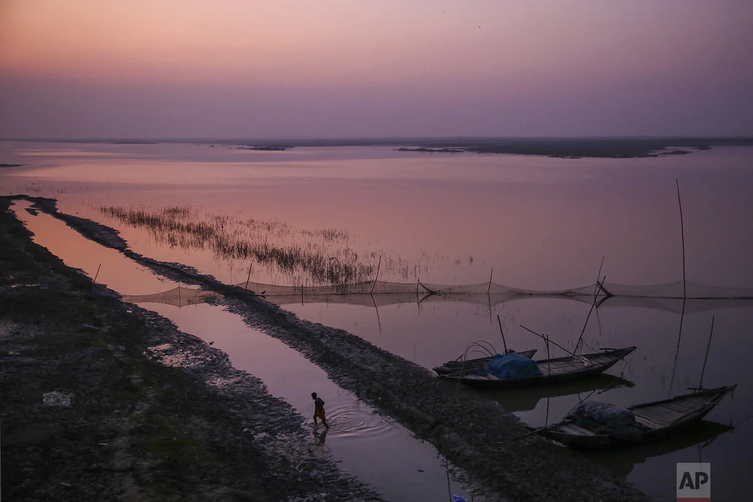 An Indian fisherman wades through shallow waters to reach the banks of the river Ganges after sundown in Bhagalpur in the eastern Indian state of Bihar, Nov. 13, 2019. (AP Photo/Altaf Qadri)
