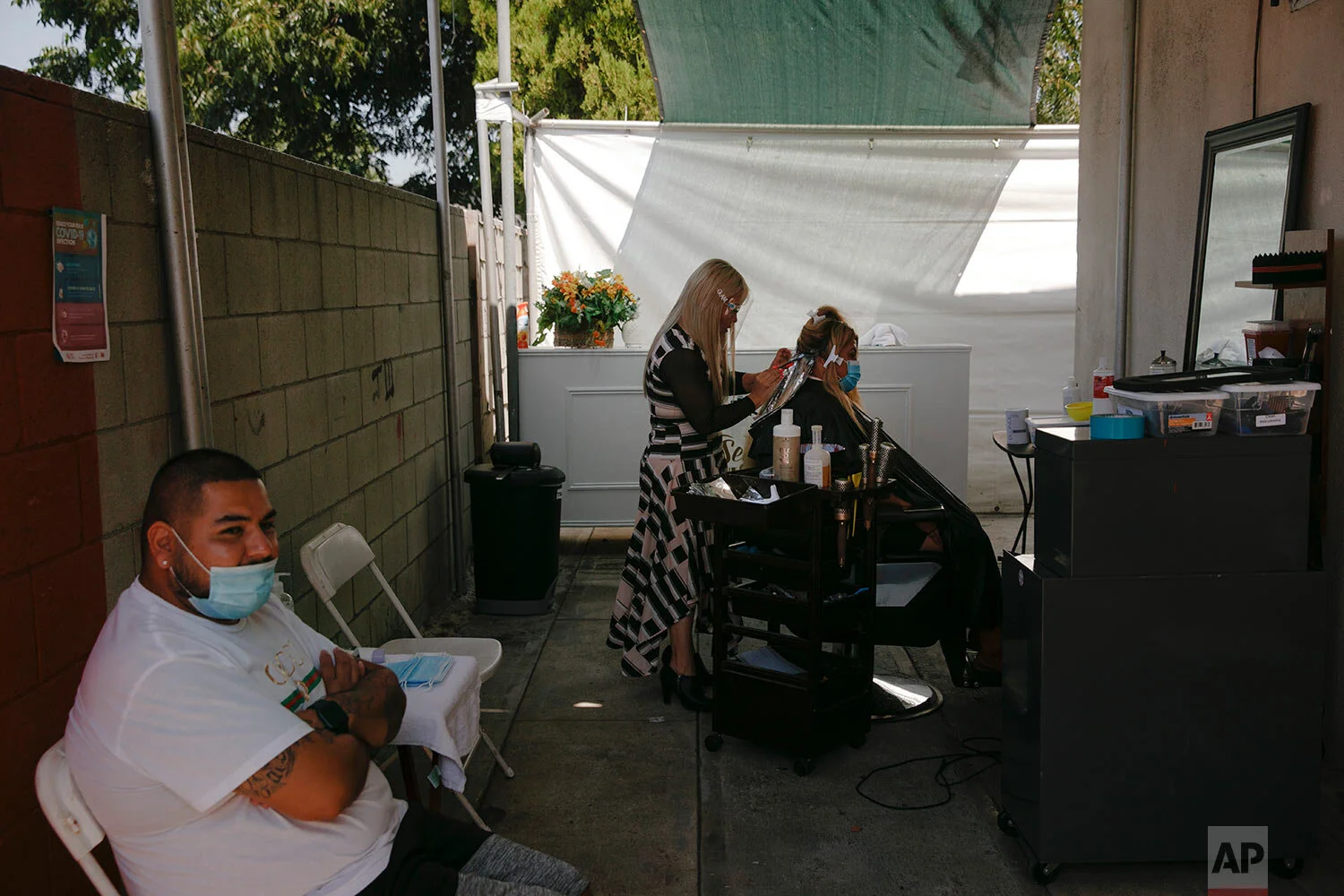 Mario Perez, 32, left, sits on a chair while his wife, Jocelyn, gets her hair bleached at an outdoor hair salon in the Watts neighborhood of Los Angeles, Aug. 3, 2020. (AP Photo/Jae C. Hong)