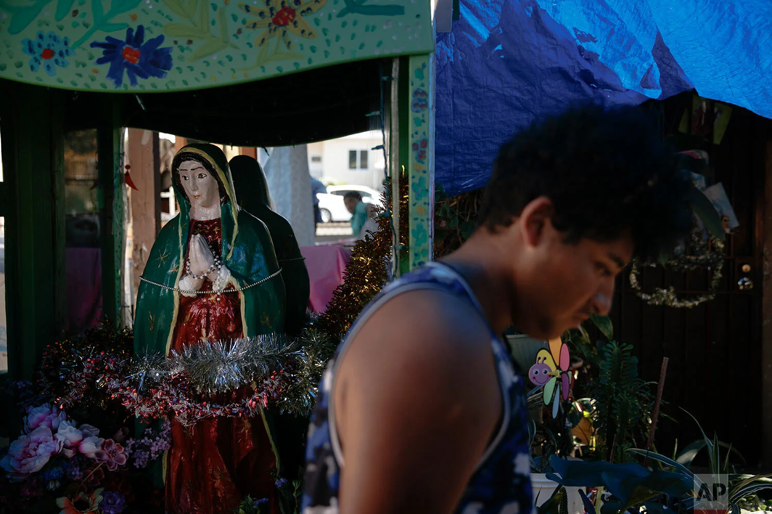 Noel Mata walks past a statue of Our Lady of Guadalupe made by his parents in the Watts neighborhood of Los Angeles, Aug. 3, 2020. (AP Photo/Jae C. Hong)