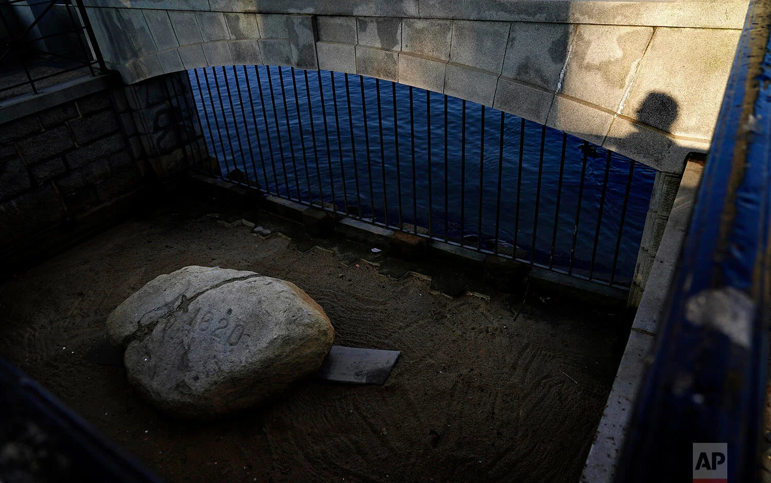 A visitor casts a shadow while looking at Plymouth Rock, the traditional point of arrival of the Pilgrims on the Mayflower in 1620, in Plymouth, Mass., Wednesday, Aug. 12, 2020. (AP Photo/David Goldman)