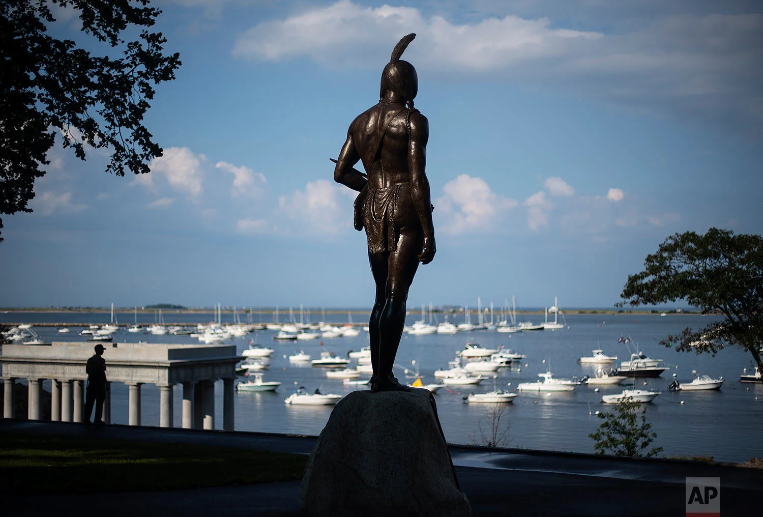 A statue of the Native Sachem (leader) Massasoit looks out over the traditional point of arrival of the Pilgrims on the Mayflower in 1620, in Plymouth, Mass., Wednesday, Aug. 12, 2020. (AP Photo/David Goldman)
