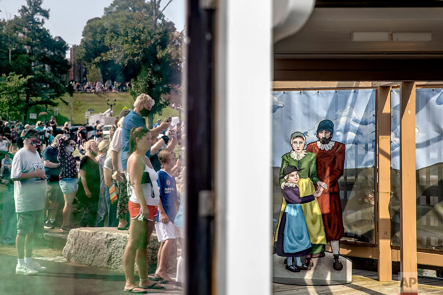 A crowd is reflected in the window of a ticket booth next to a cutout, right, of Pilgrims as they wait for the Mayflower II, a replica of the original Mayflower ship that brought the Pilgrims to America 400 year ago, to sail into Plymouth, Mass., Monday, Aug. 10, 2020. (AP Photo/David Goldman)