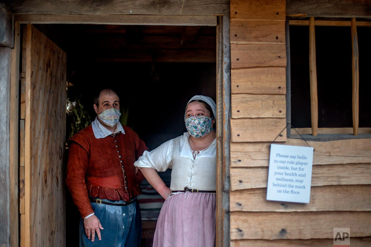Museum educators Doug Blake, left, and Alexandra Cervenak, playing the roles of Pilgrims William and Alice Bradford, wait for visitors at Plimoth Plantation, a reconstructed Pilgrim settlement and living history exhibit, Wednesday, Aug. 12, 2020, in Plymouth, Mass. (AP Photo/David Goldman)