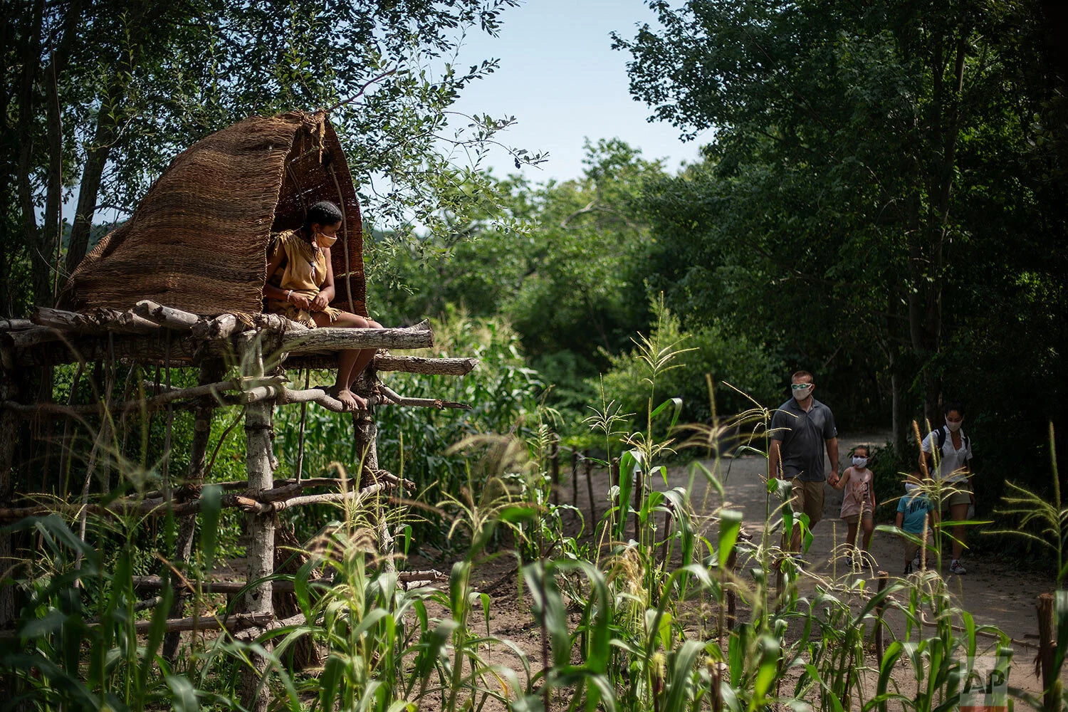 Alyssa Harris, a member of the Mashpee Wampanoags and a museum educator at Plimoth Plantation, a living history exhibit, sits in a corn watch tower as visitors walk through the Wampanoag Homesite, Wednesday, Aug. 12, 2020, in Plymouth, Mass. (AP Photo/David Goldman)