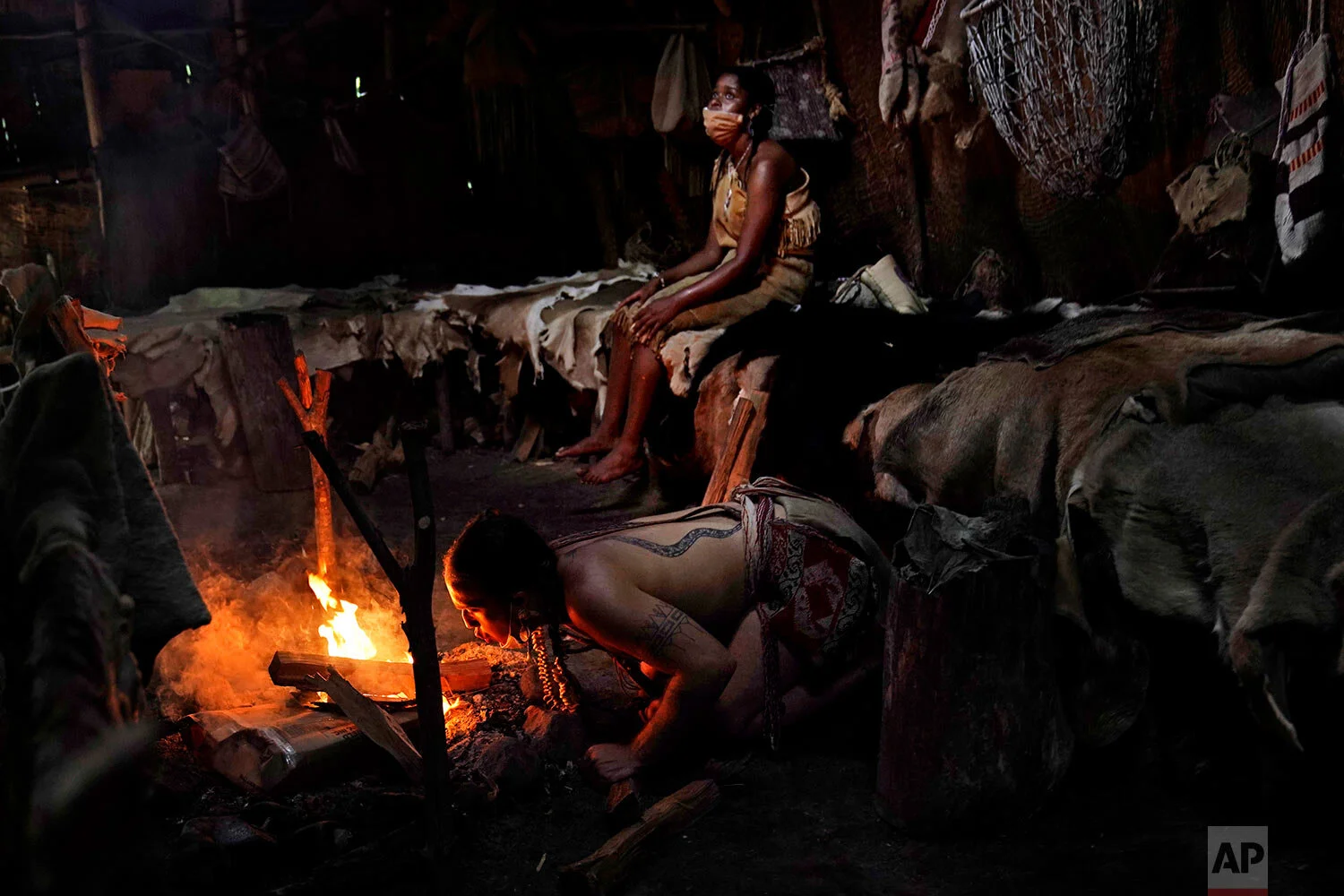 Tatanka Gibson, kneeling, a member of the Haliwa band of Nansemond and Saponi and a museum educator at Plimoth Plantation, a reconstructed living history exhibit, starts a fire inside a nush wetu after getting soaked in a downpour while waiting for visitors at the Wampanoag Homesite, Wednesday, Aug. 12, 2020, in Plymouth, Mass. (AP Photo/David Goldman)