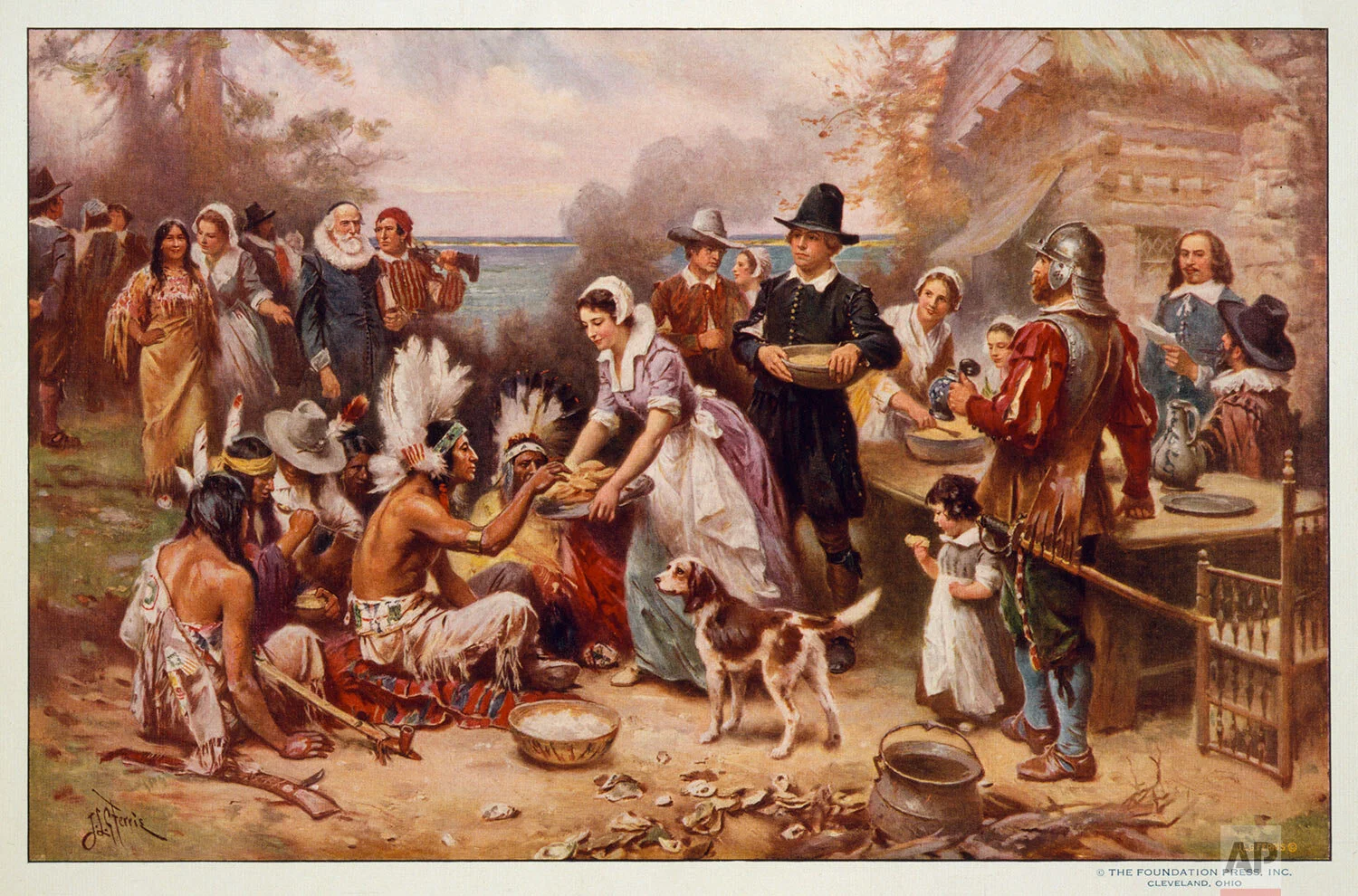 This image made available by the Library of Congress shows a reproduction of a painting by Jean Leon Gerome Ferris titled "First Thanksgiving" made between 1900-1920. (J.L.G. Ferris/Library of Congress via AP)